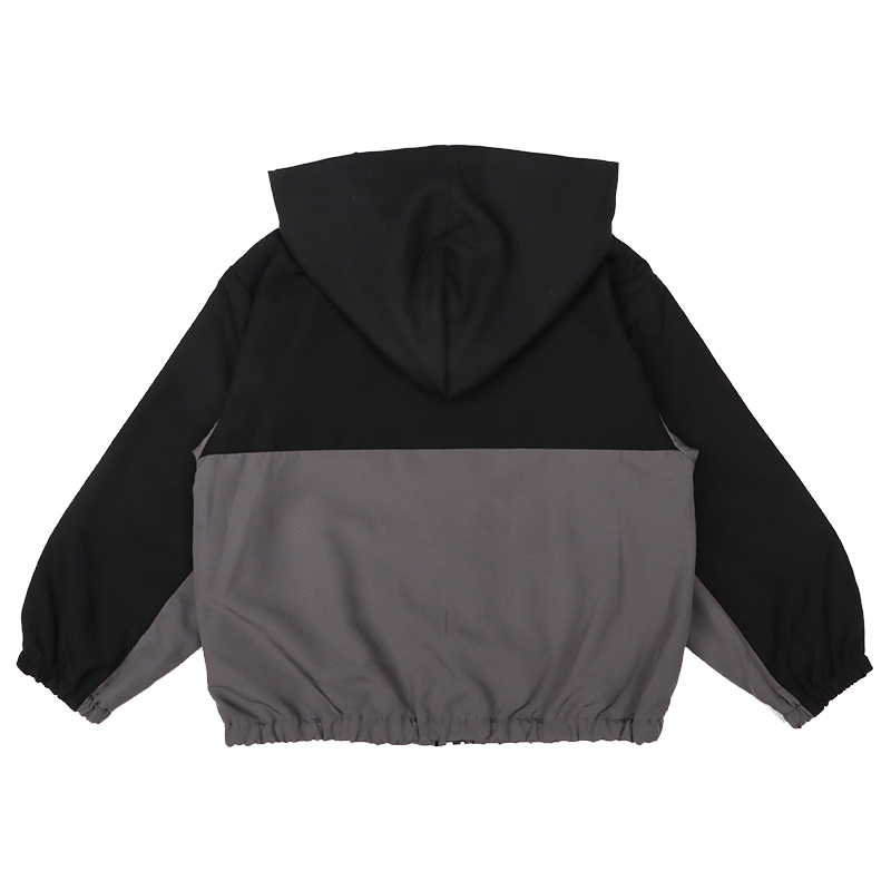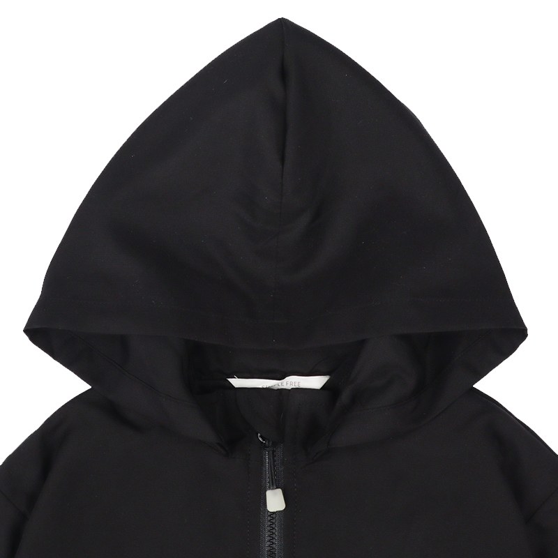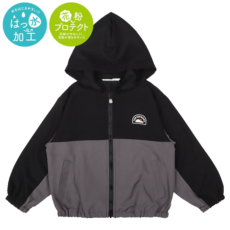 カジュアルな雰囲気のポリエステルリップストップの表生地に、裏地はさらりとしたメッシュを使用したジャケット。春先の肌寒いときに便利な1枚です。はっ水加工と花粉がつきにくく、落ちやすい加工がほどこしてあり、雨の日や花粉が多い春先にぴったりな機能付きです。フードは取り外し可能で、通園通学にもおすすめです。