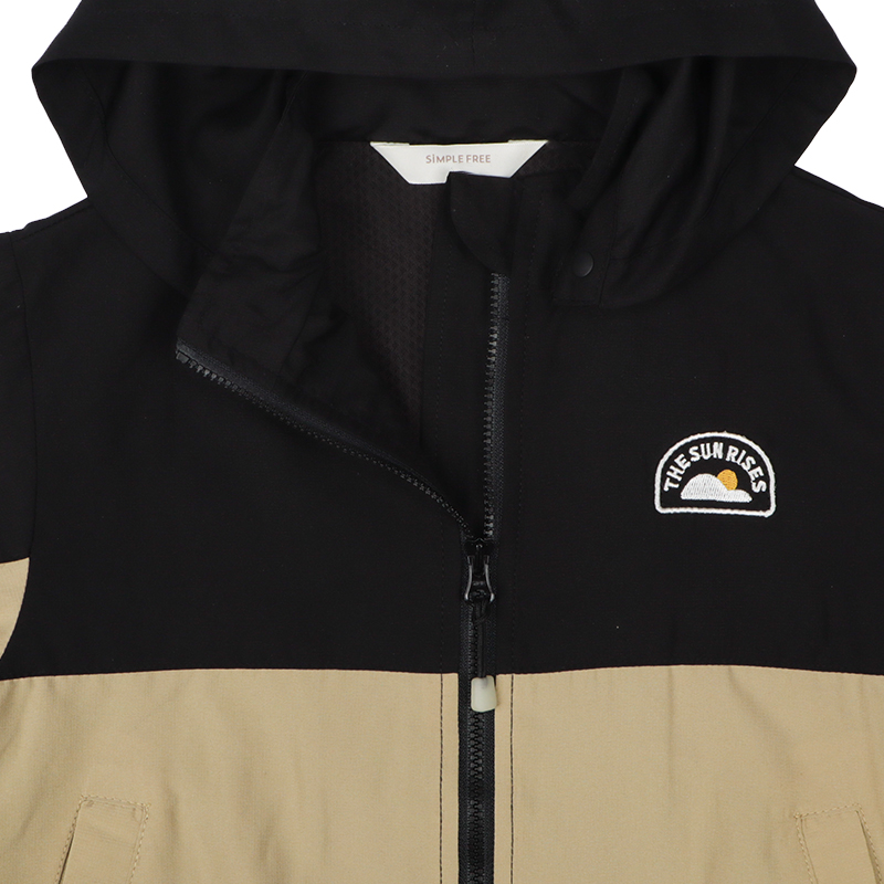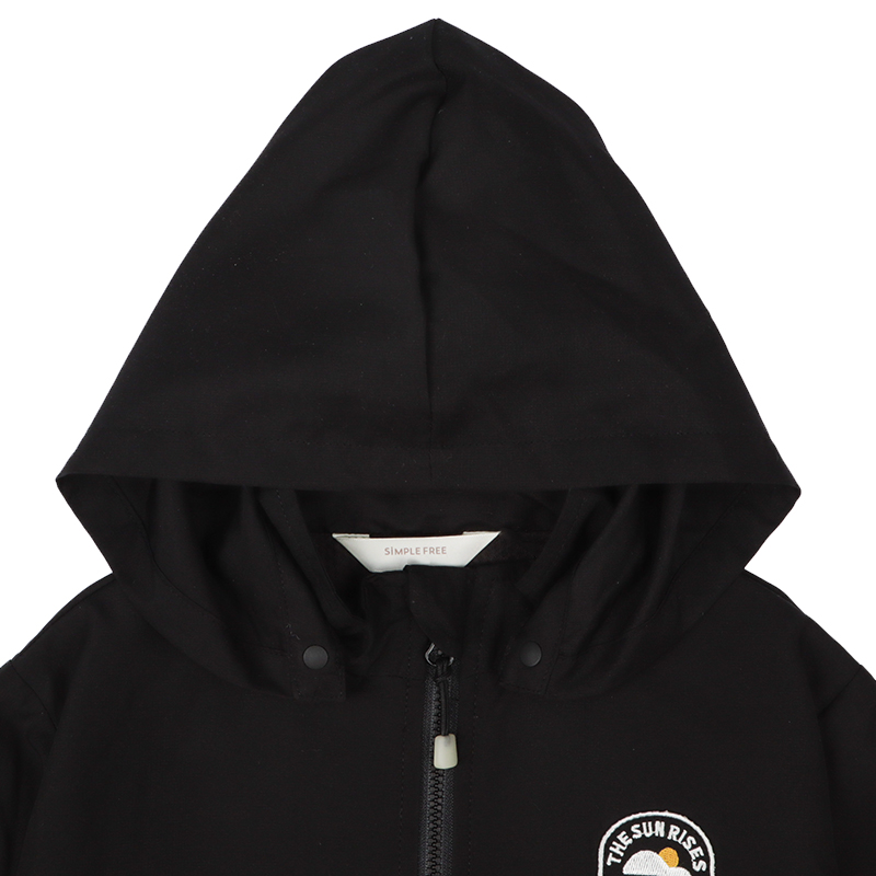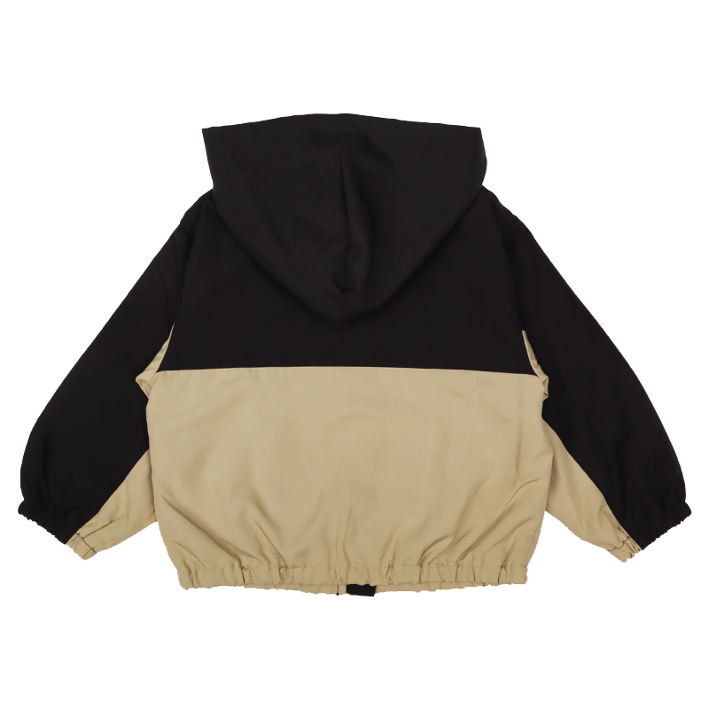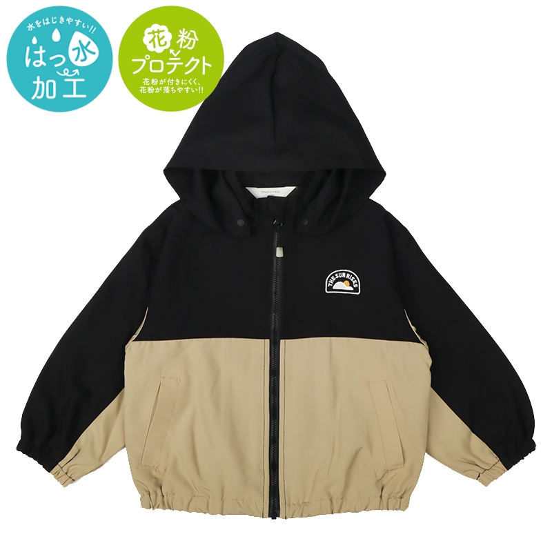 カジュアルな雰囲気のポリエステルリップストップの表生地に、裏地はさらりとしたメッシュを使用したジャケット。春先の肌寒いときに便利な1枚です。はっ水加工と花粉がつきにくく、落ちやすい加工がほどこしてあり、雨の日や花粉が多い春先にぴったりな機能付きです。フードは取り外し可能で、通園通学にもおすすめです。