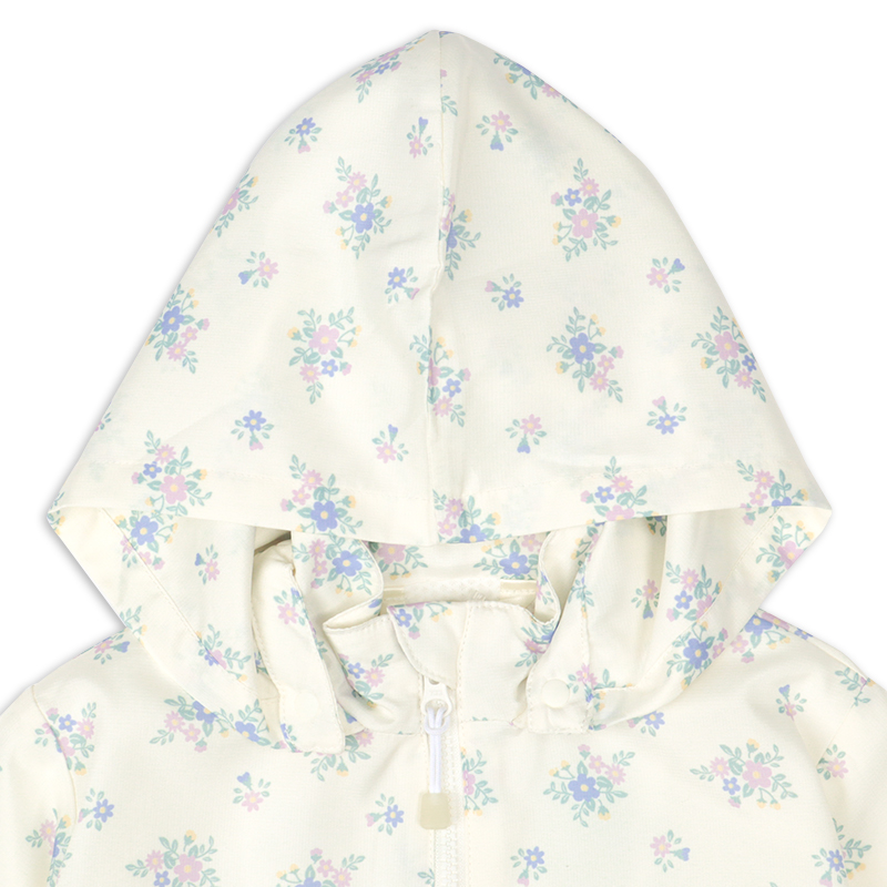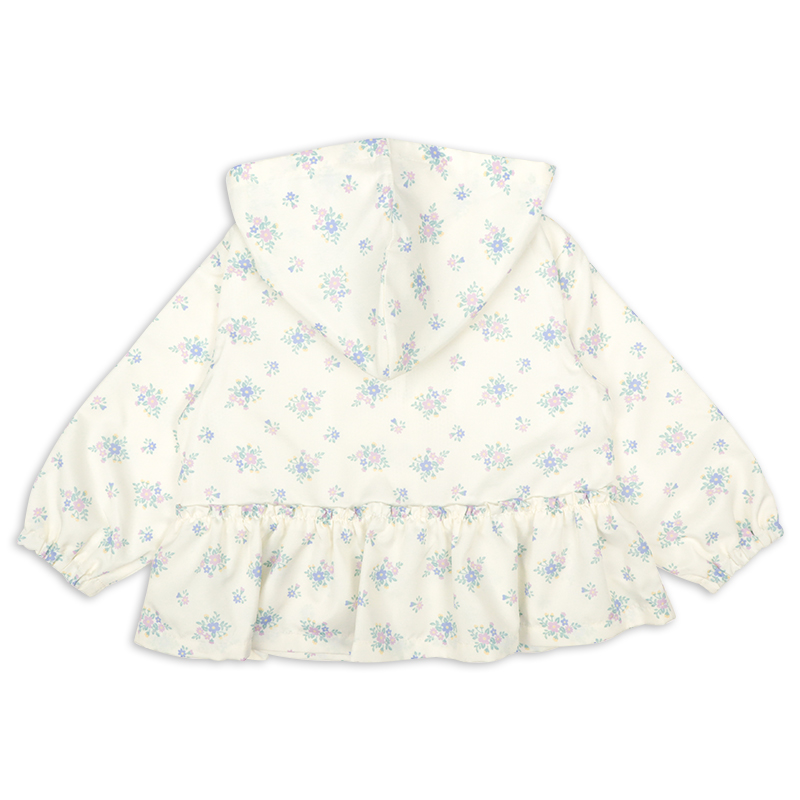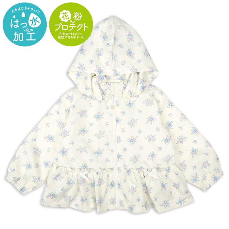 カジュアルな雰囲気のポリエステルリップストップの表生地に、裏地はさらりとしたメッシュを使用したジャケット。ふわっと広がるペプラムシルエットが可愛らしいデザインです。はっ水加工と花粉がつきにくく、落ちやすい加工がほどこしてあり、雨の日や花粉が多い春先にぴったりな機能付きです。フードは取り外し可能で、通園通学にもおすすめです。