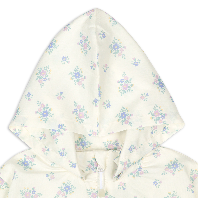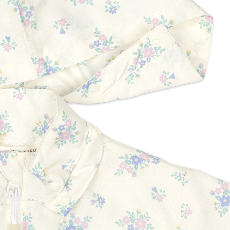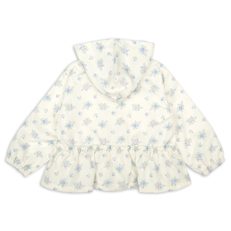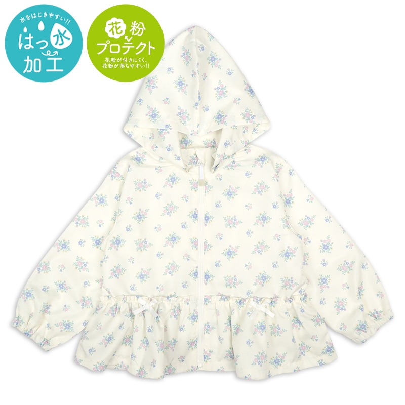 カジュアルな雰囲気のポリエステルリップストップの表生地に、裏地はさらりとしたメッシュを使用したジャケット。ふわっと広がるペプラムシルエットが可愛らしいデザインです。はっ水加工と花粉がつきにくく、落ちやすい加工がほどこしてあり、雨の日や花粉が多い春先にぴったりな機能付きです。フードは取り外し可能で、通園通学にもおすすめです。