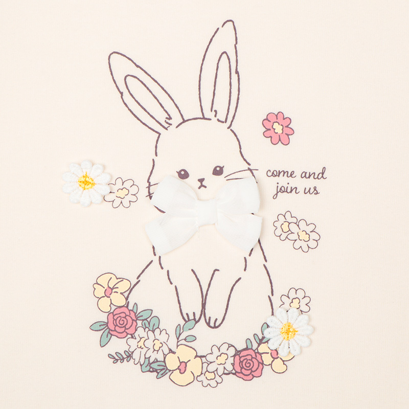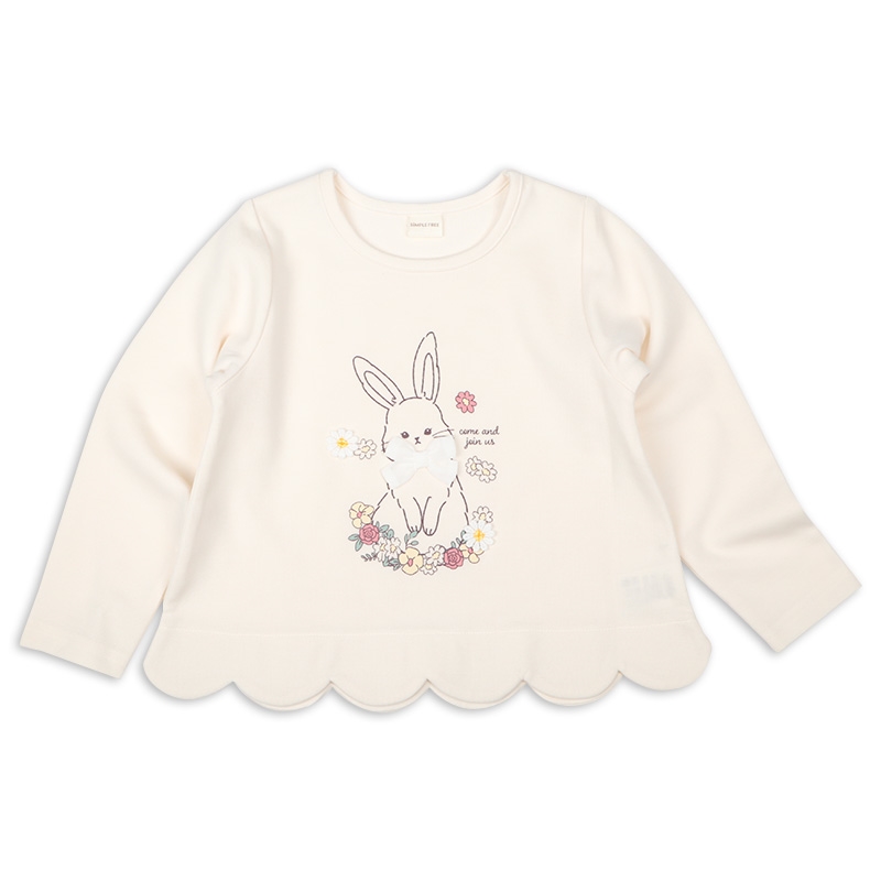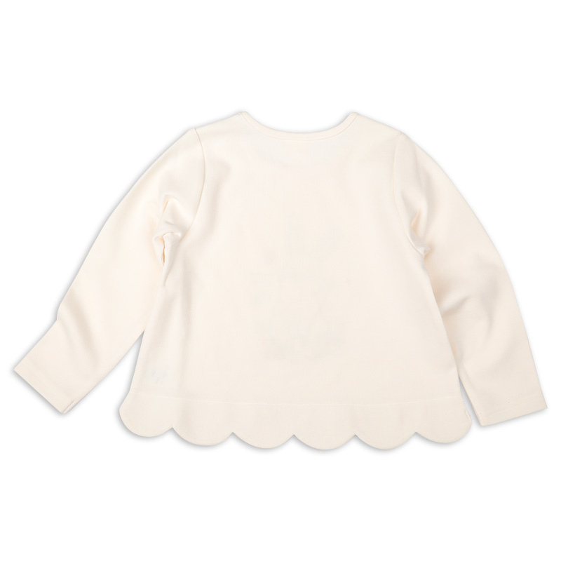 ストレッチ性のあるポンチ素材で季節の変わり目に大活躍の長袖トップスです。 ネコとウサギのモチーフ付き。裾のスカラップ仕様がかわいらしいアクセントになっています。 通園通学からお出かけまで幅広いシーンにおすすめです。