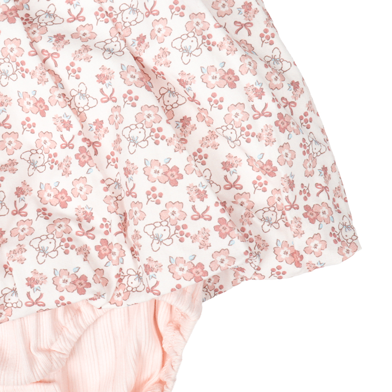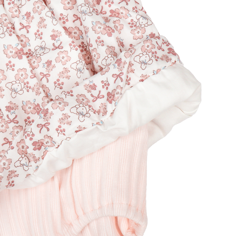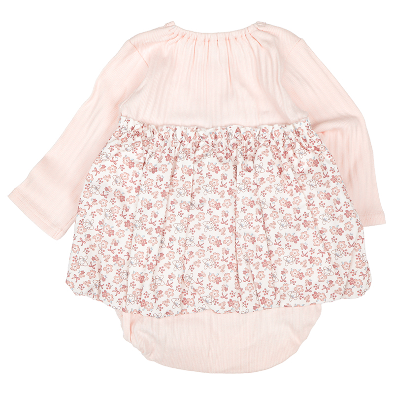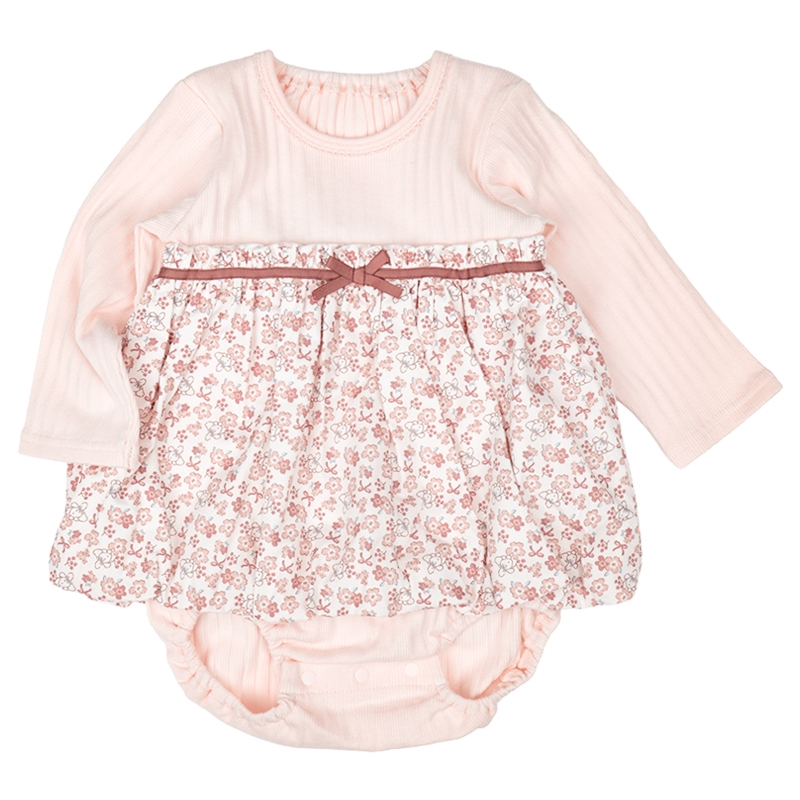 赤ちゃん本舗オリジナルデザインのバルーンロンパースです。表面感のあるランダムテレコ素材にぽわんと広がるかわいい花柄のブロード素材のバルーンスカートが乳児の可愛らしさを引き立てます。切替部分のリボンもキュートなポイントです。1枚でおでかけ着にぴったりのロンパースです。