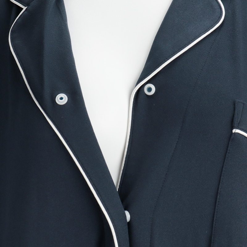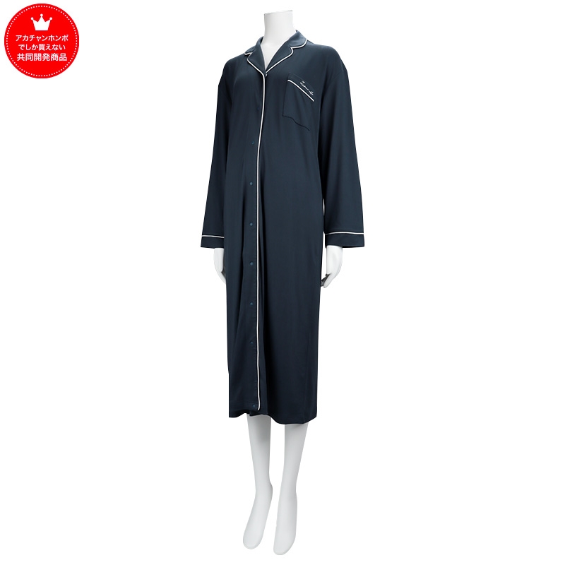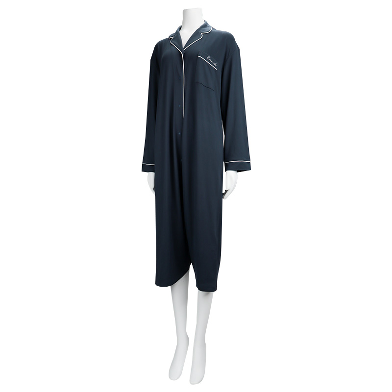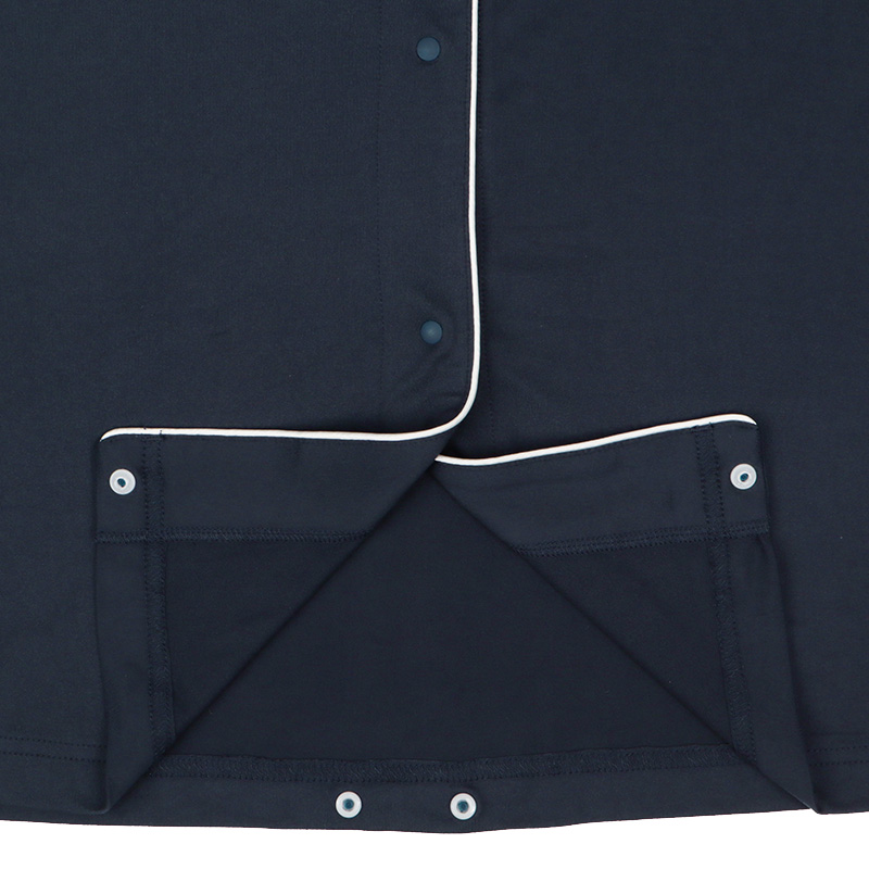 2Wayシーン 入院準備用のロングワンピースパジャマとして 退院後はおうちでのリラックスワンピースとして 裾のおやすみボタンを留めてロンパースとしても着られる、便利な2WAY仕様。寝ている時や回診時など、裾がまくり上がりません。 上から下までスナップボタンなので、授乳時、入院中の検診にも着脱簡単。