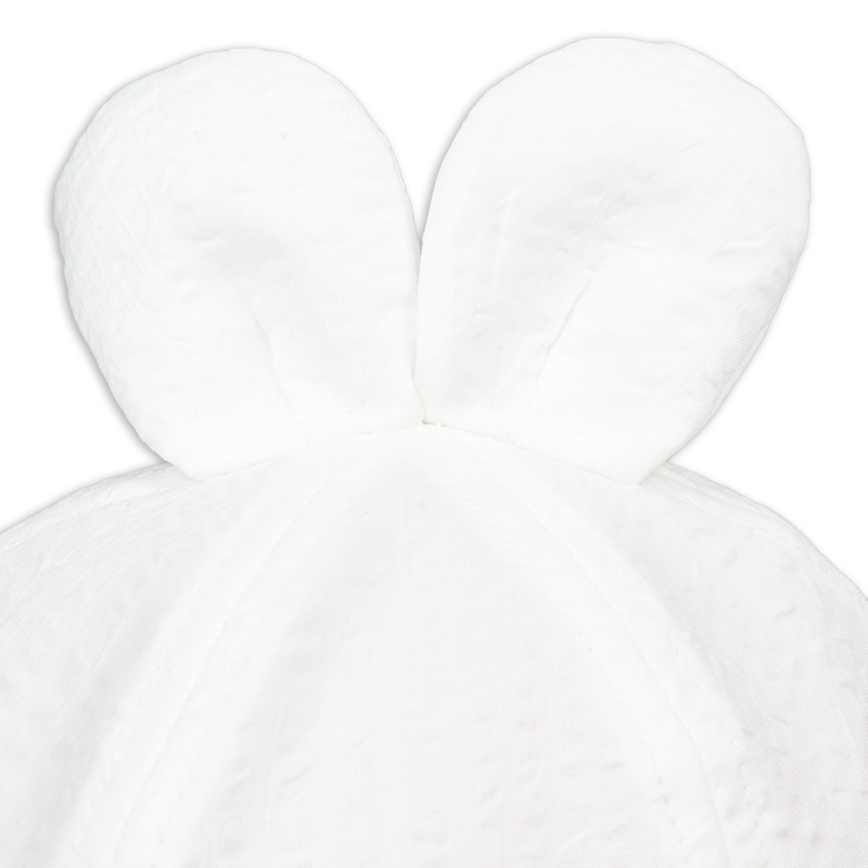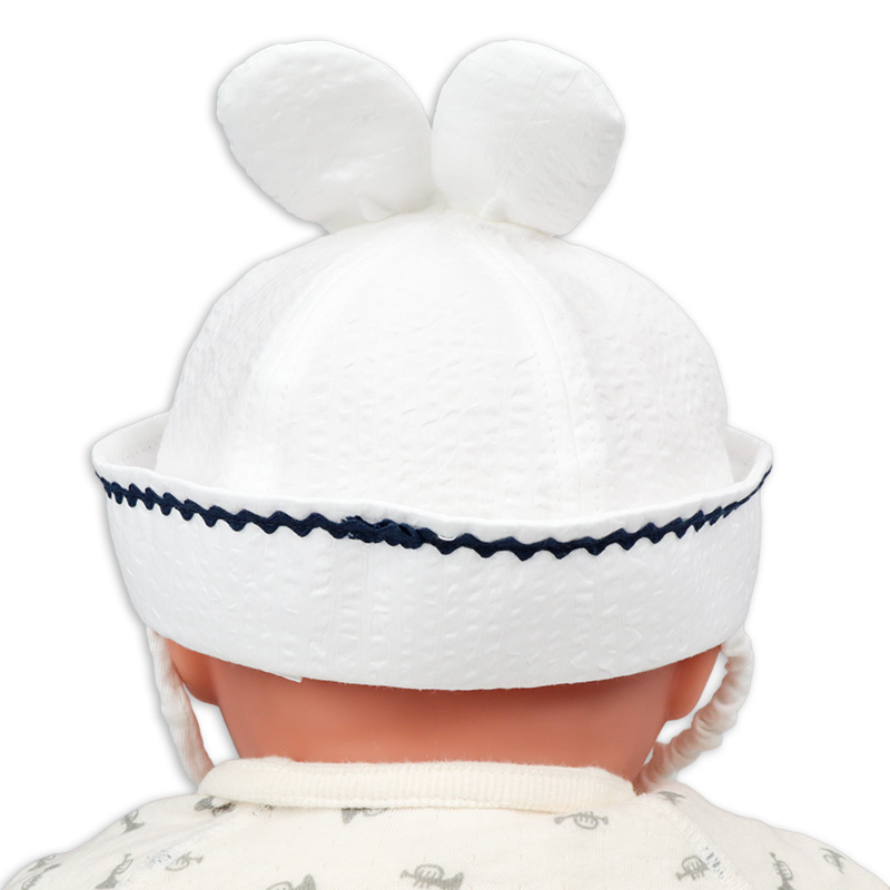 爽やかなマリンハットのシルエットに小さなくま耳や長いうさぎ耳をあしらいました。 つばが少し上向きになったマリンハット特有の形は、視界を遮りにくく、赤ちゃんが周囲の景色を楽しみながら日よけができます。 あごゴムには赤ちゃんの肌に優しい綿素材でゴムを包んだものを使用しているので、元気に動きまわっても、風が吹いても安心です。 UVカット率も高く一枚一枚丁寧に作られた日本製です。