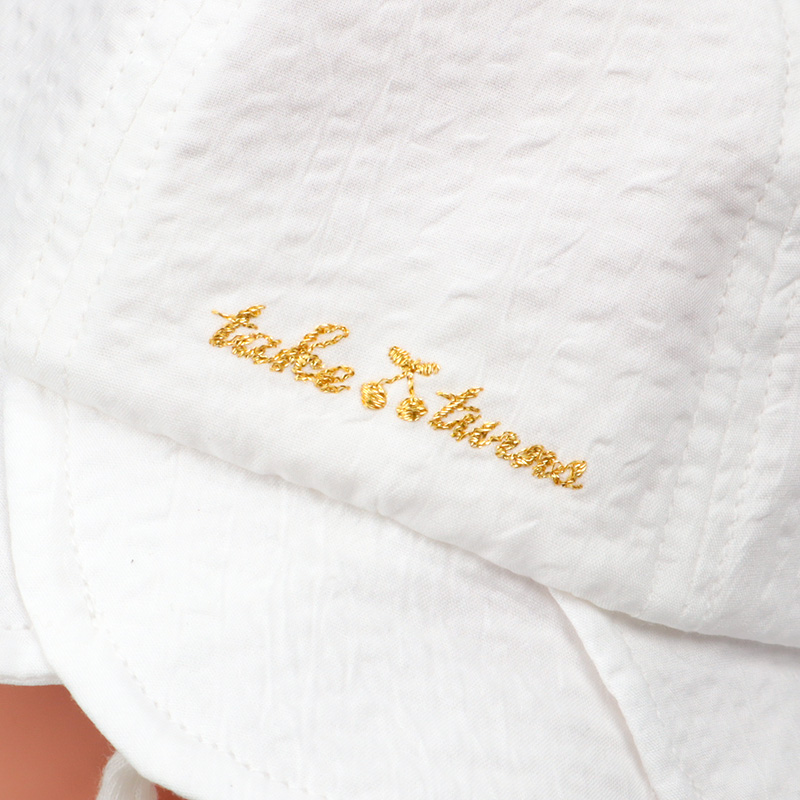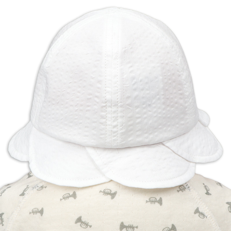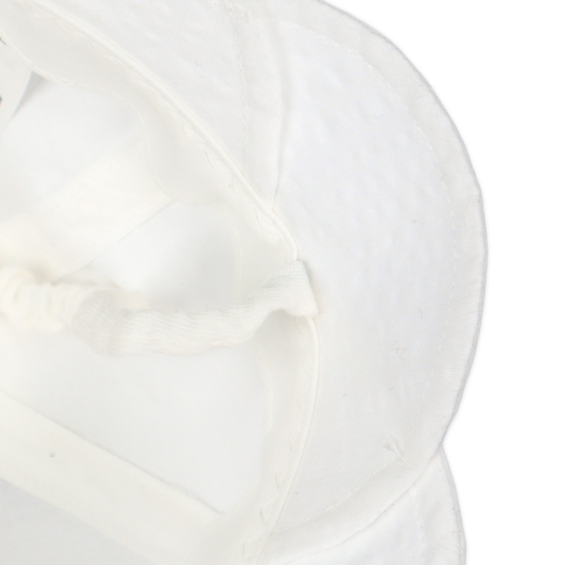 花びら型のつばが特徴のハット。 シンプルなコーディネートにプラスするだけで、一気にお出かけモードを華やかに演出します。 360度広がるつばが、首筋やお顔を紫外線から守ります。 風に飛ばされたり、赤ちゃんが自分で脱ぎ捨ててしまうのを防ぐあごゴムには赤ちゃんの肌に優しい綿素材でゴムを包んだものを使用しています。 一枚一枚丁寧に作られた日本製です。