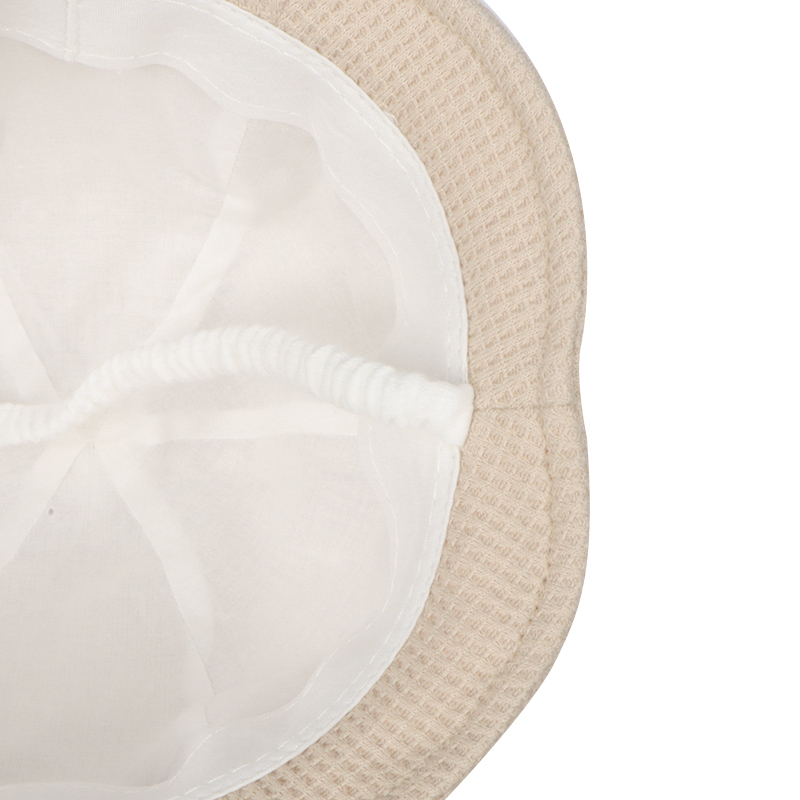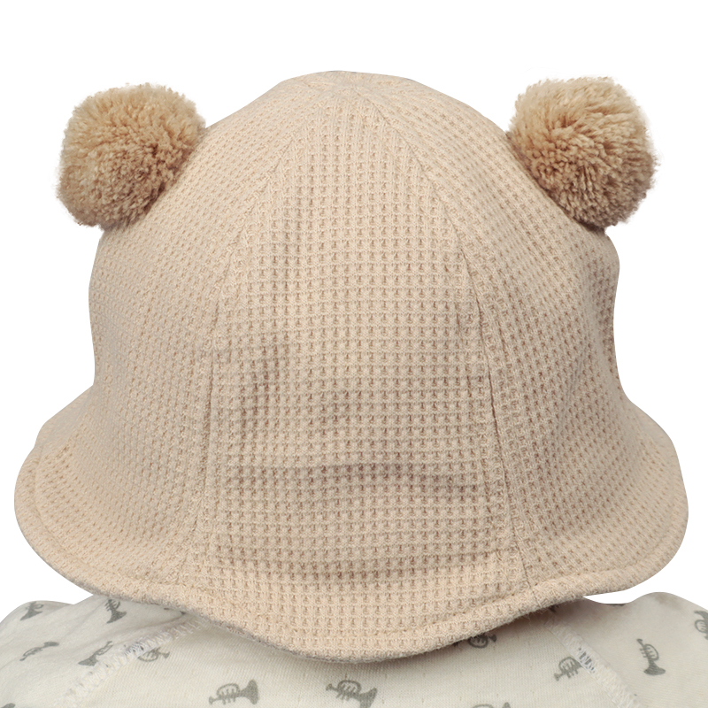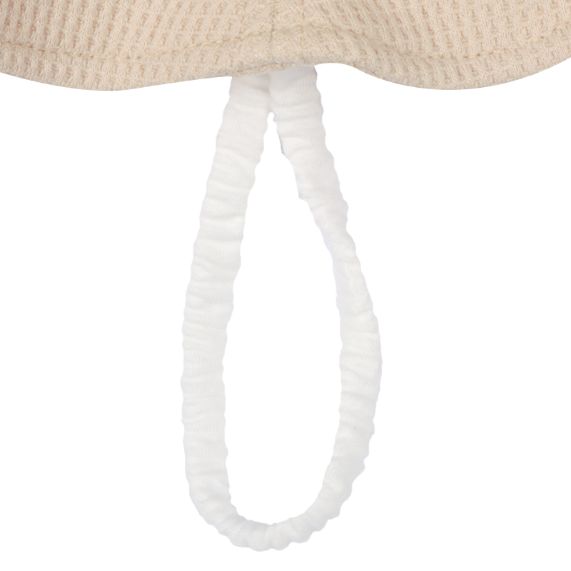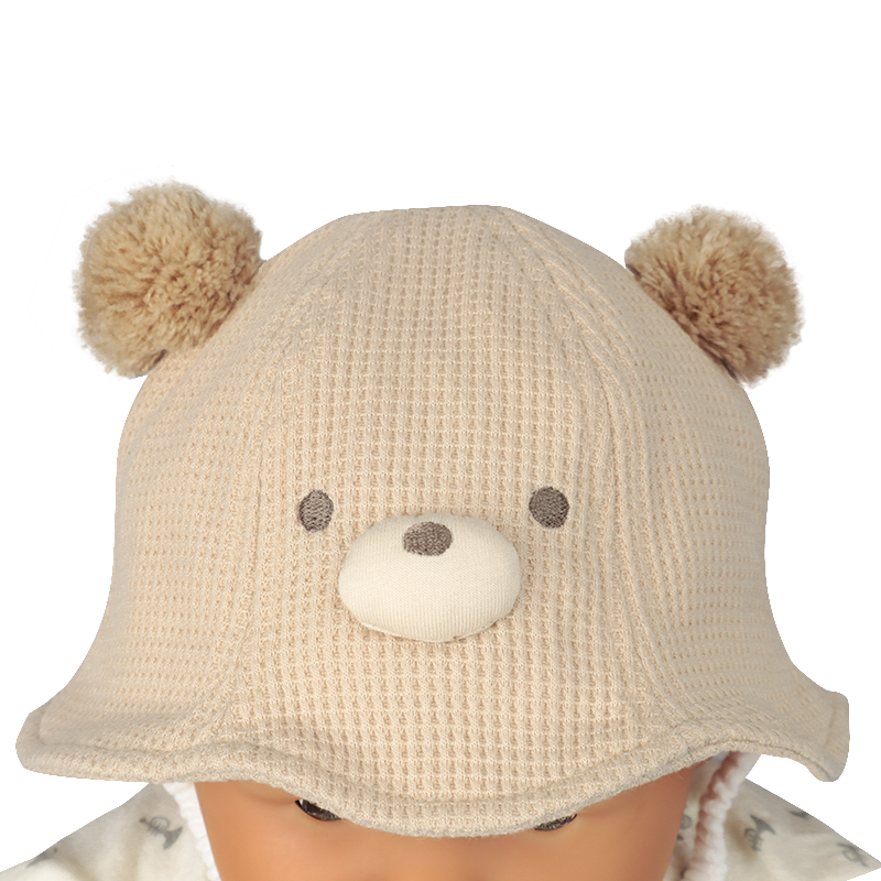 丸みのあるフォルムが可愛らしい、クマモチーフのアイテムです。 ボンボン耳とつぶらな表情の刺繍がポイント。 本体にはワッフル生地を使用しており、質感を楽しめます。 風などによる帽子の落下を防ぐアゴゴム付き。 アゴゴムは生地でくるんだ仕様なので肌あたりが優しいです。