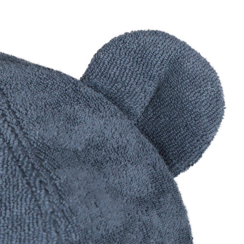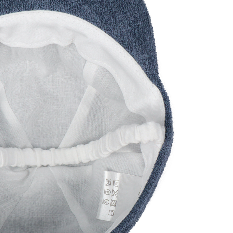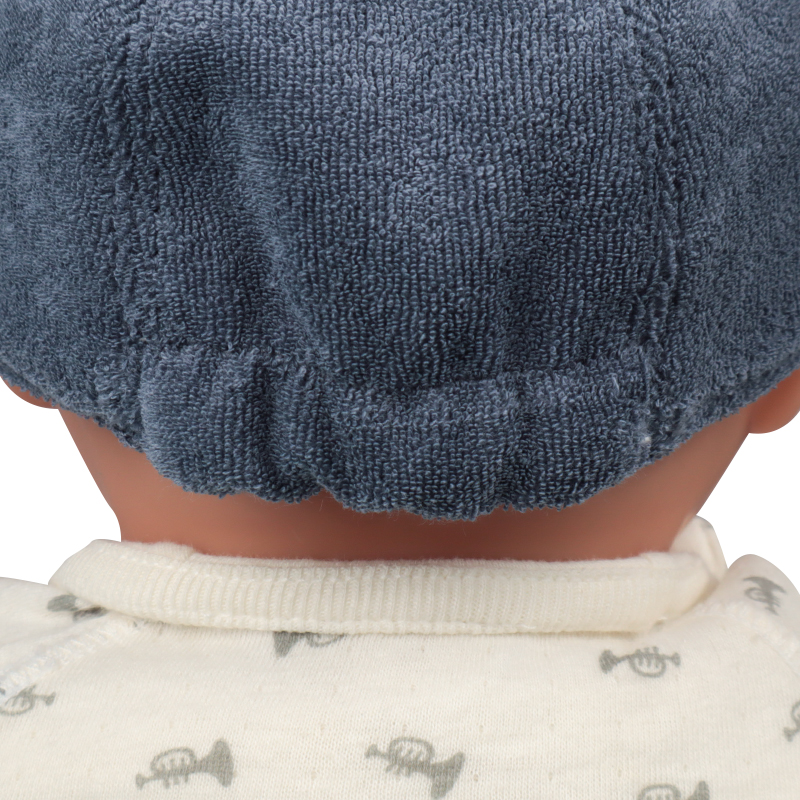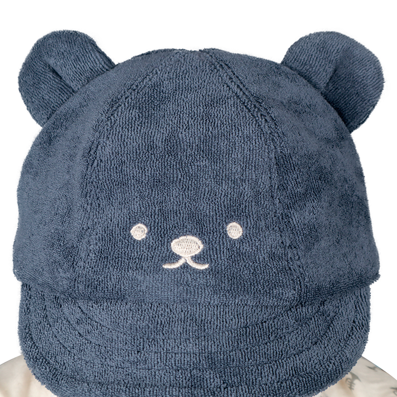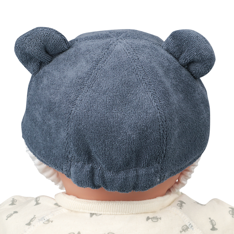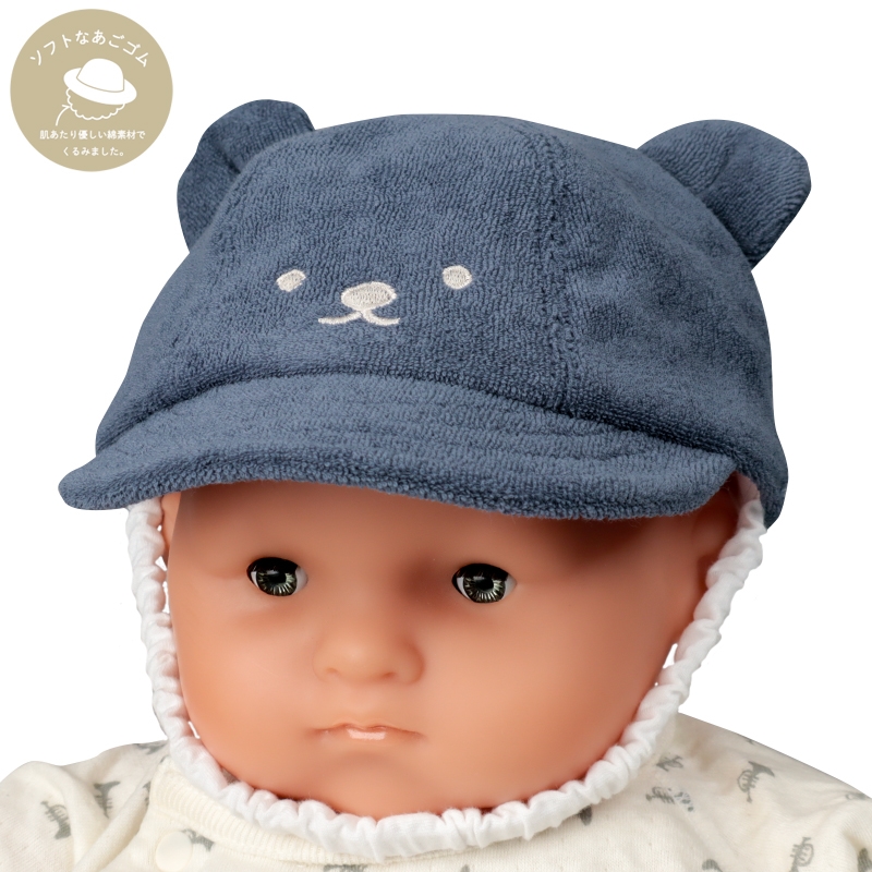 やわらかなニュアンスカラーのアイテムです。 タック入りの耳とつぶらな表情の刺繍がポイント。 本体にはタオル地を使用しており、質感を楽しめます。 風などによる帽子の落下を防ぐアゴゴム付き。 アゴゴムは生地でくるんだ仕様なので肌あたりが優しいです。