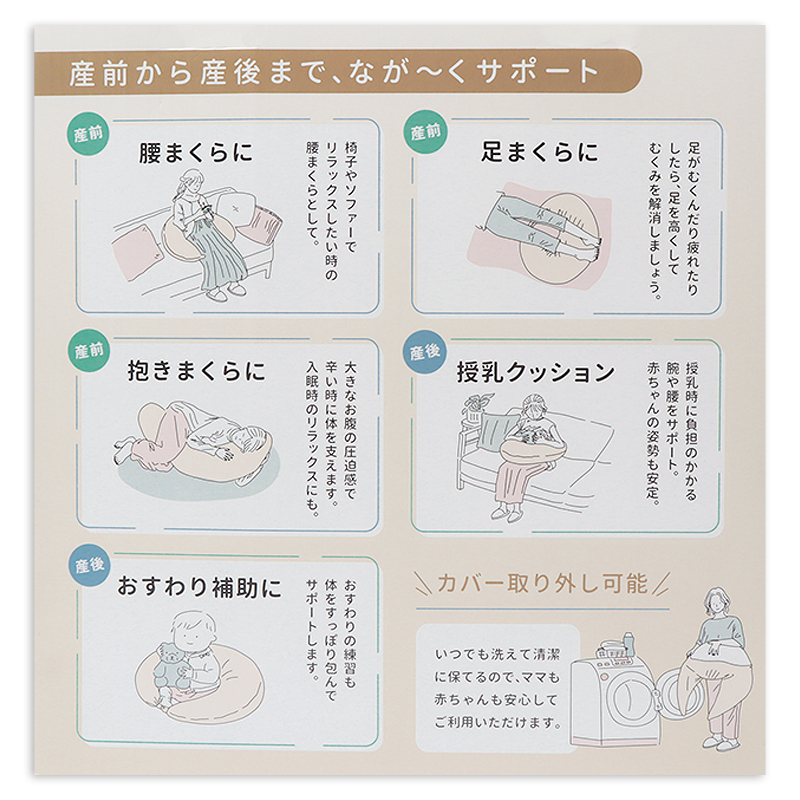 ●素材=カバー生地(綿100%)、ヌード生地(ナイロン82% ポリウレタン18%) ビーズ(ポリスチレン100%) ●サイズ(約・cm)90×29×16cm ●対象期間=産前~産後 ●洗濯表示=カバーのみ洗濯可 ●原産国=日本製