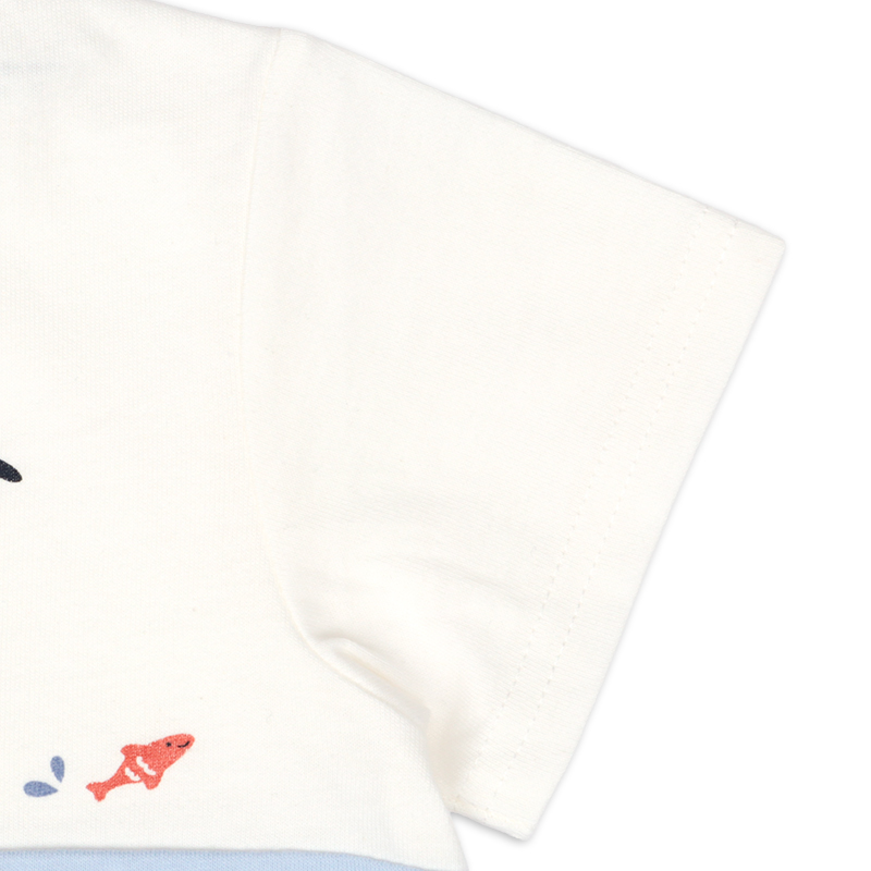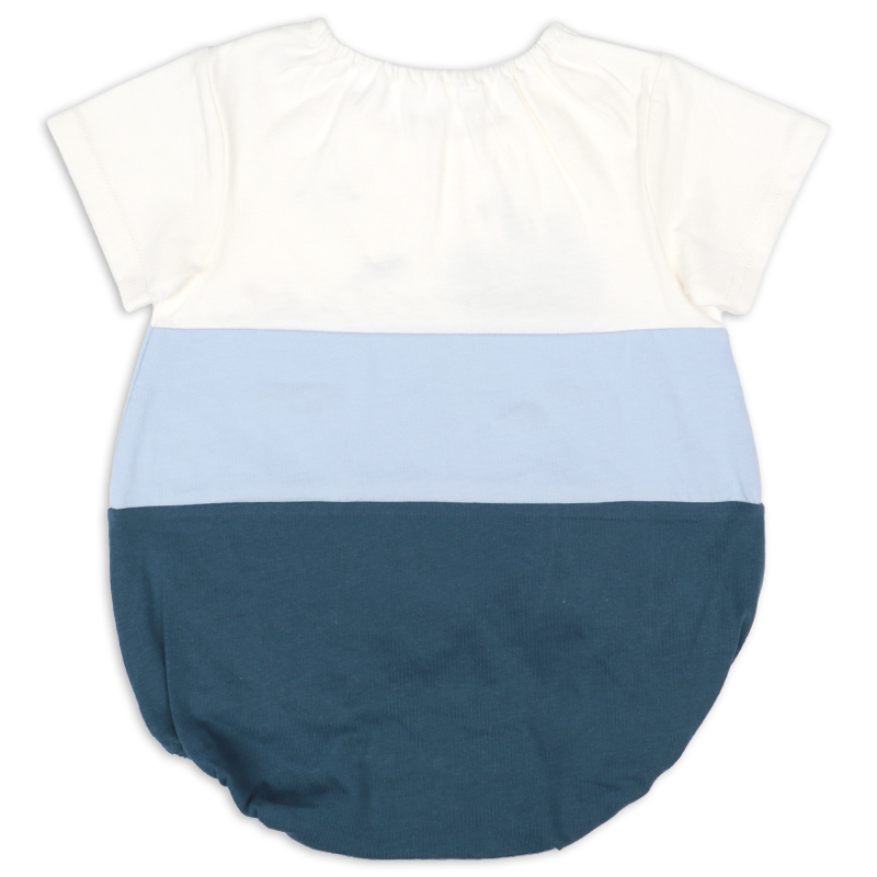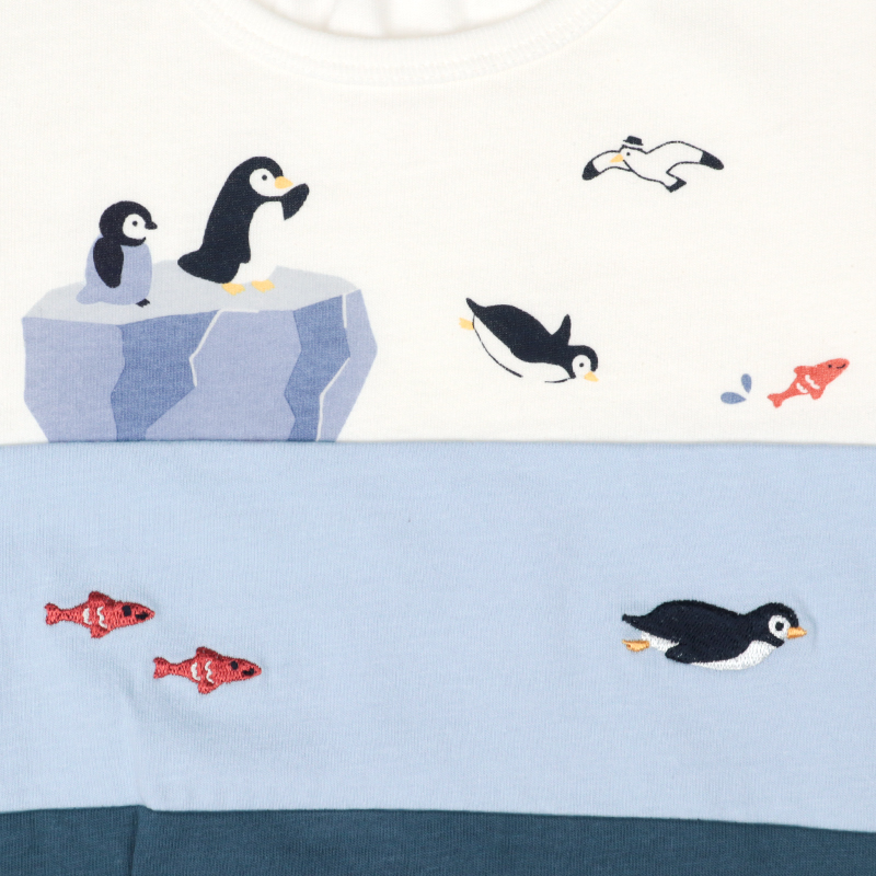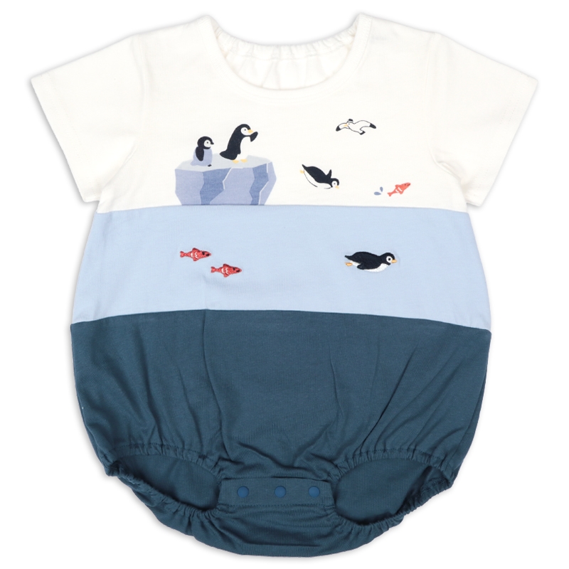 天竺素材のロンパースに、海の生き物や乗り物が切替の上部分にプリントされており、真ん中部分には刺しゅうが施されている、贅沢なロンパースです。