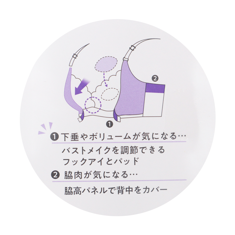 卒乳に向けて変化するバストを調節。バストを纏めてスタイルアップ。脇高設計で気になるはみ肉を押さえます。 ①下垂やボリュームが気になる・・。バストメイクを調節できるフックアイとパッド ②脇肉が気になる・・。脇高パネルで背中をカバー