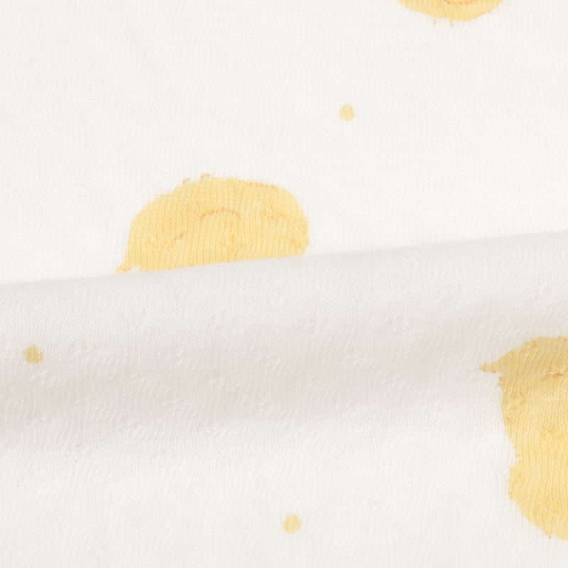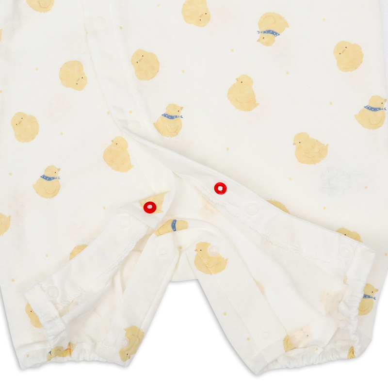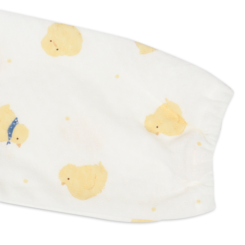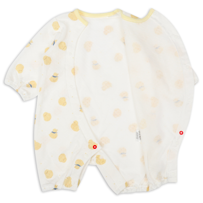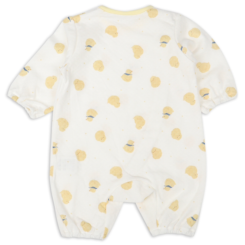 軽くて柔らか素材のひよこ柄がかわいいちびオールです。 綿100%の接結天竺の生地で作られたこちらの商品は、軽くてやわらかな肌触りで通気性や吸湿性に優れています。 また赤ちゃんの動きを妨げないデザインは、手足をバタバタ活発に動かすようになってきた赤ちゃんにピッタリです。