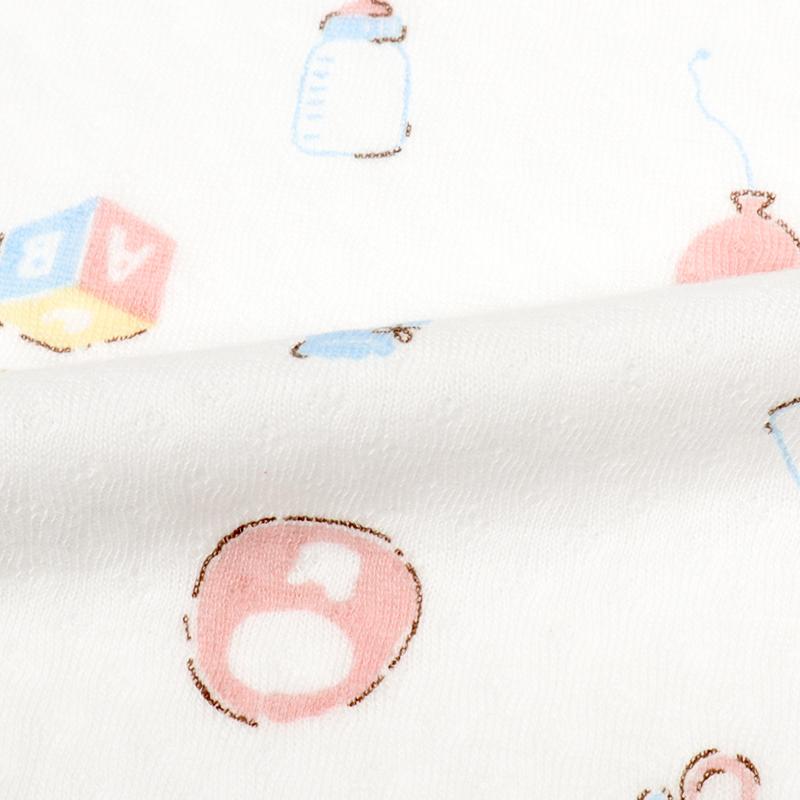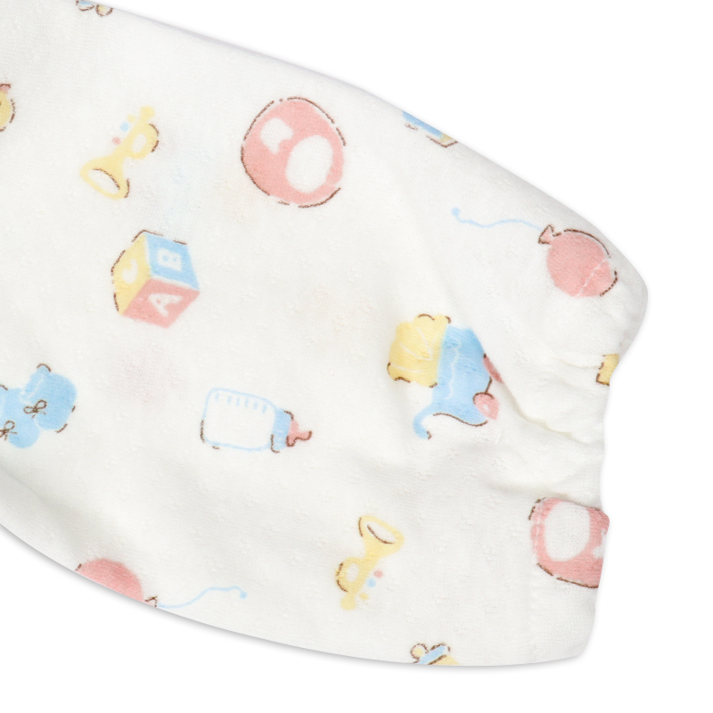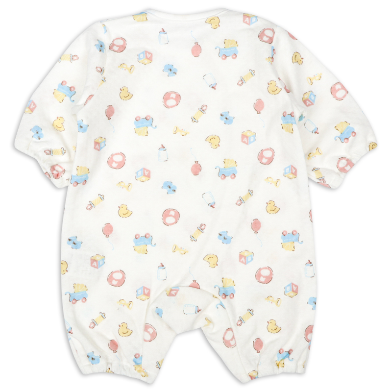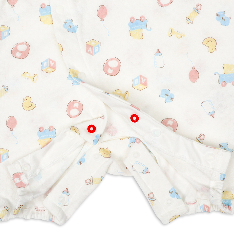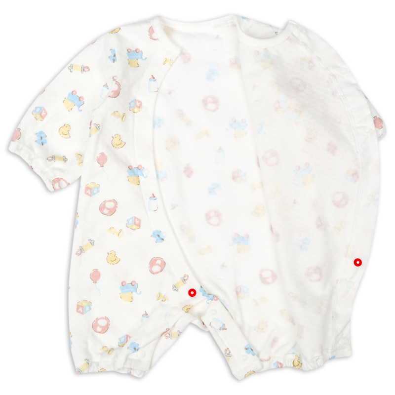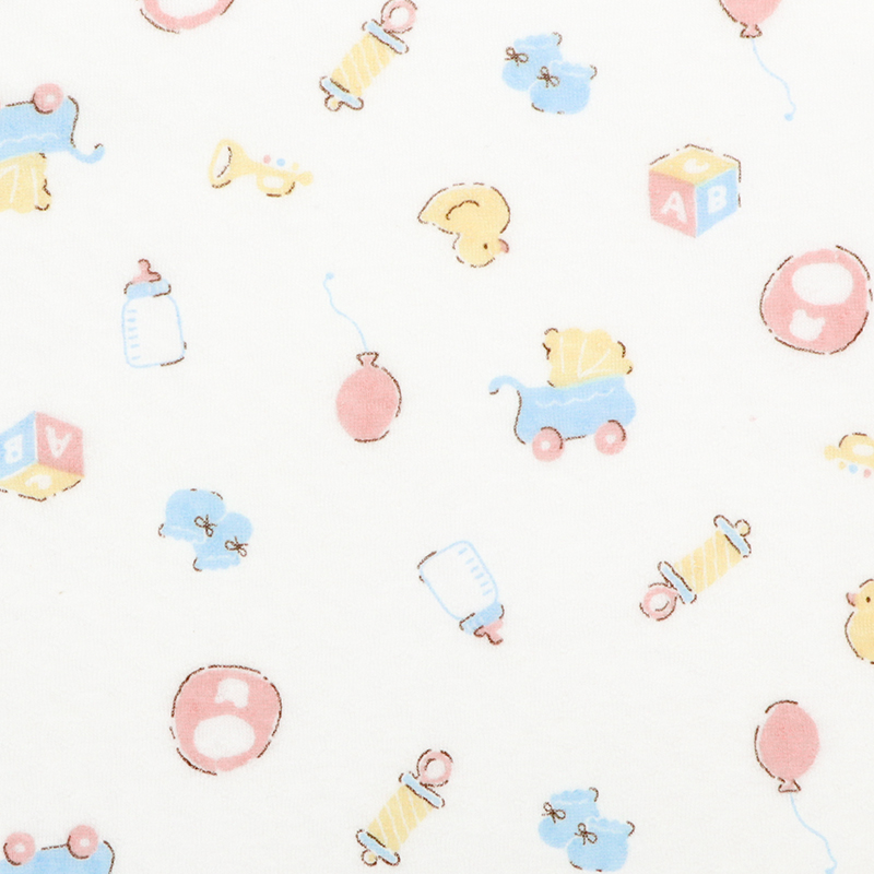 軽くて柔らか素材の赤ちゃんのおもちゃ柄がかわいいちびオールです。 綿100%の接結天竺の生地で作られたこちらの商品は、軽くてやわらかな肌触りで通気性や吸湿性に優れています。 また赤ちゃんの動きを妨げないデザインは、手足をバタバタ活発に動かすようになってきた赤ちゃんにピッタリです。