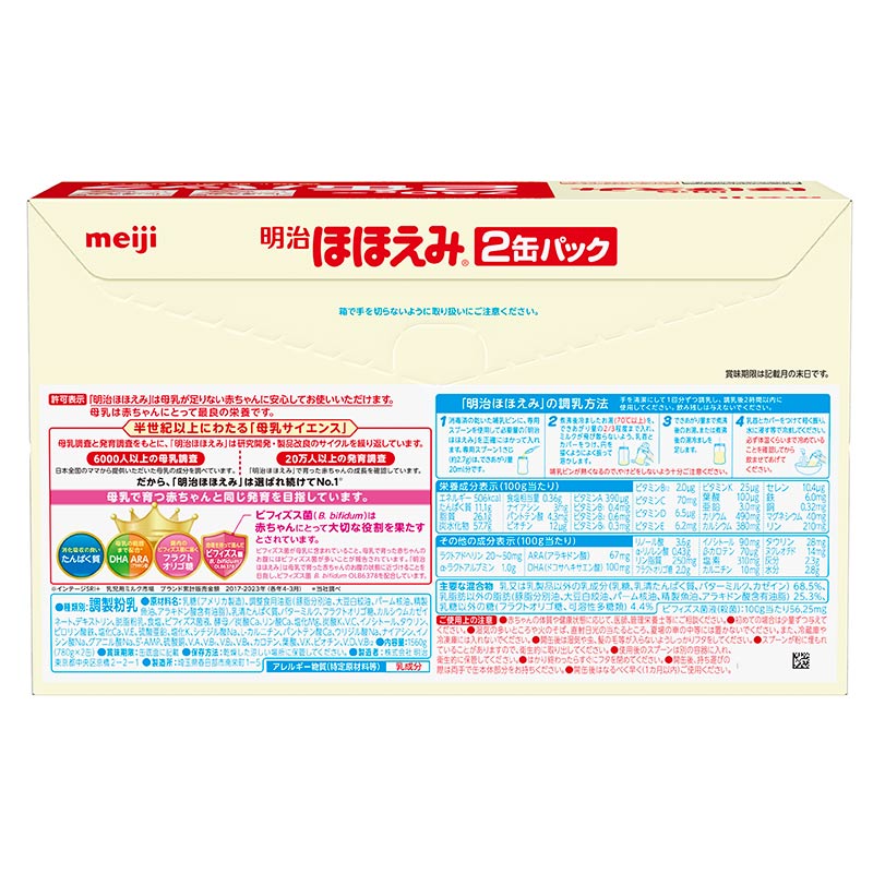 ●種類別 調製粉乳 ●対象月齢 0~1歳頃まで ●内容量 1560g(780g×2) ●原材料 乳糖(アメリカ製造)、調整食用油脂(豚脂分別油、大豆白絞油、パーム核油、精製魚油、アラキドン酸含有油脂)、乳清たんぱく質、バターミルク、フラクトオリゴ糖、カルシウムカゼイネート、デキストリン、脱脂粉乳、食塩、ビフィズス菌液、酵母/炭酸Ca、リン酸Ca、塩化Mg、炭酸K、V.C、イノシトール、タウリン、ピロリン酸鉄、塩化Ca、V.E、硫酸亜鉛、塩化K、シチジル酸Na、L-カルニチン、パントテン酸Ca、ウリジル酸Na、ナイアシン、イノシン酸Na、グアニル酸Na、5-AMP、硫酸銅、V.A、V.B1、V.B2、V.B6、カロテン、葉酸、V.K、ビオチン、V.D、V.B12