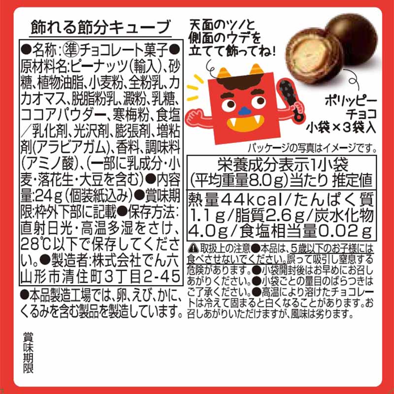 ●対象月齢:5歳以上 ●内容量:24g(個装紙込み) ●原材料:ピーナッツ(輸入)、砂糖、植物油脂、小麦粉、全粉乳、カカオマス、脱脂粉乳、澱粉、乳糖、ココアパウダー、寒梅粉、食塩/乳化剤、光沢剤、膨張剤、増粘剤(アラビアガム)、香料、調味料(アミノ酸)、 (一部に乳成分・小麦・落花生・大豆を含む)