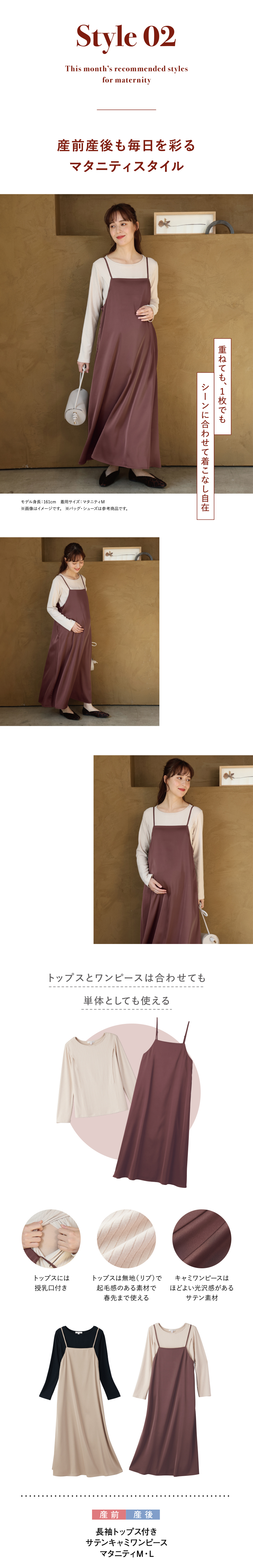 長袖トップス付きの、キャミワンピースとなります。 トップスはテレコリブ素材、ワンピースはサテン素材です。 トップスの両脇には授乳口が付いており、脇からさっと授乳する事が出来ます。 ワンピースの両脇にはコンシールファスナーが付いており、授乳する時とても便利です。