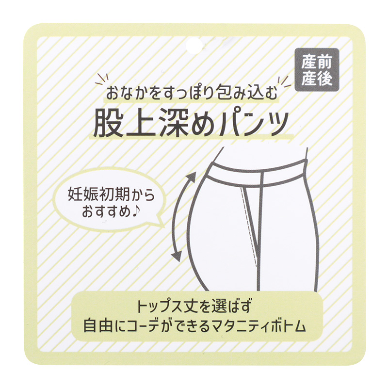 ●素材= ポリエステル95% ポリウレタン5% ●洗濯表示=液温は40℃を限度とし、洗濯機で弱い洗濯処理ができる。漂白処理はできない。タンブル乾燥はできない。日陰でのつり干し乾燥がよい。底面温度120℃を限度としてスチームなしでアイロン仕上げができる。石油系溶剤又はデカメチルペンタシクロシロキサンによる弱いドライクリーニングができる。弱いウェットクリーニング処理ができる。 ●サイズスペック=M 総丈100.5 股下67 渡り30 裾巾29.5 L 総丈103.5 股下69 渡り31.2 裾巾30 ●対象期間=妊娠初期・産後