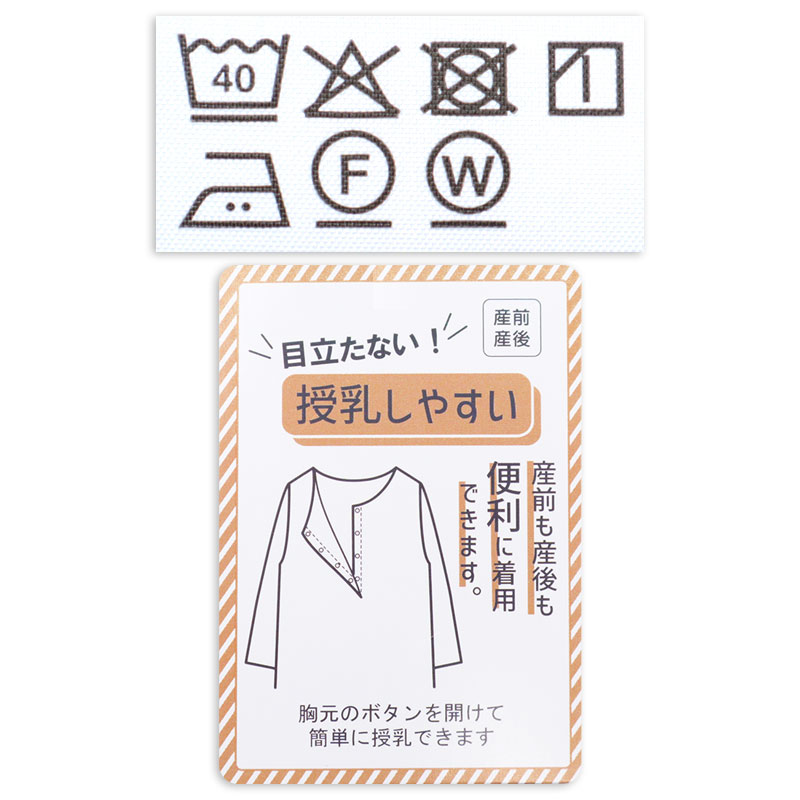 ●素材=ポリエステル65% 綿35% ●洗濯表示=液温は40℃を限度とし洗濯機で弱い洗濯処理ができる。漂白処理はできない。タンブル乾燥はできない。日陰でのつり干し乾燥がよい。底面温度160℃を限度としてアイロン仕上げができる。石油系溶剤又はデカメチルペンタシクロシロキサンによる弱いドライクリーニングができる。弱い処理でのウエットクリーニングができる。 ●サイズスペック= M 身幅52.8 着丈118.5 肩幅47.8 袖丈53.5 L 身幅54.8 着丈120.5 肩幅48.9 袖丈54.5 ●対象期間=産前~産後