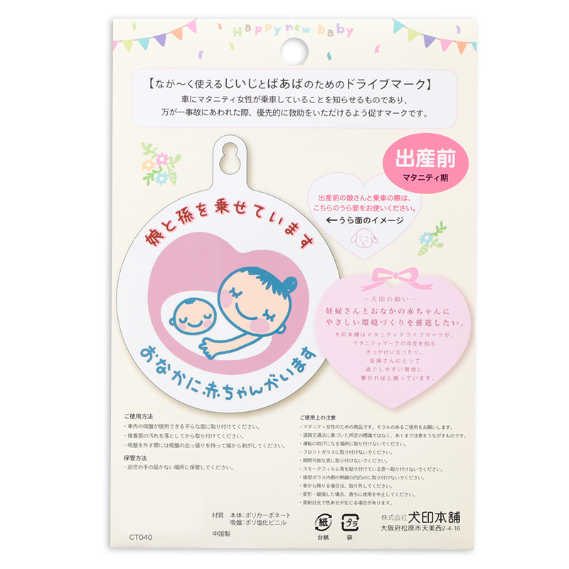 マタニティドライブマークは、車にマタニティ女性が乗車している事を知らせるものであり、万が一事故にあわれた際、優先的に救助いただけるよう促すマークです。 出産後、おじいちゃん、おばあちゃんが、後続車に赤ちゃんが乗っている事を知らせるドライブマーク