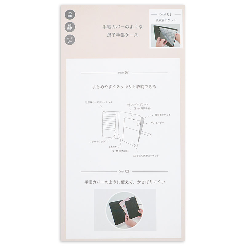 まとめやすくスッキリと収納出来ます。 B6ファイルポケット(S・M母子手帳) B6ポケット(S・M母子手帳) 領収書ポケット(B5書類) 診察券カードポケット×8 A6子ども医療証ポケット フリーポケット ペンホルダー ・対応冊子サイズ、S(A6)・M(B6)