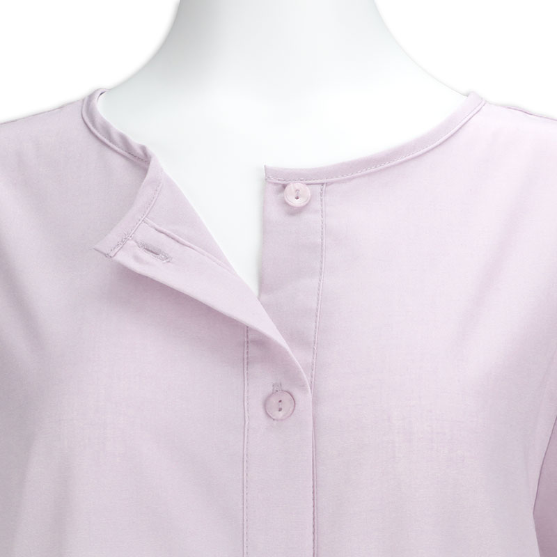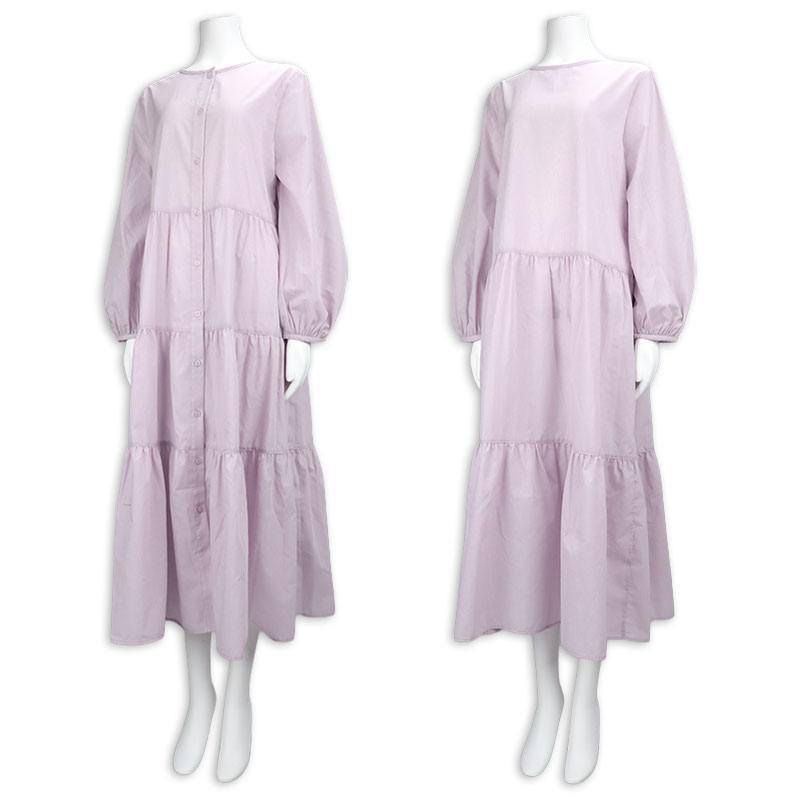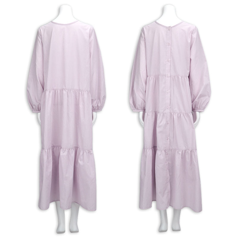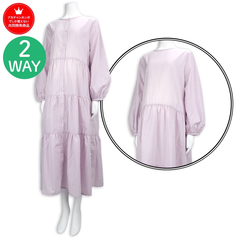 ふんわりと広がるシルエットでお腹のラインが気にならない前後着用可能な2WAYティアードワンピースです。軽やかな布帛素材で、着心地も。さらっとした肌触りで、通気性もよく重ね着アイテムとしてもお勧めです。釦側はあけてシャツライクにも着て頂けます。釦のない方はワンピースライクに見える切り替えにしています。体型を選ばず、産前産後どちらの方にもお勧めできるワンピースです。