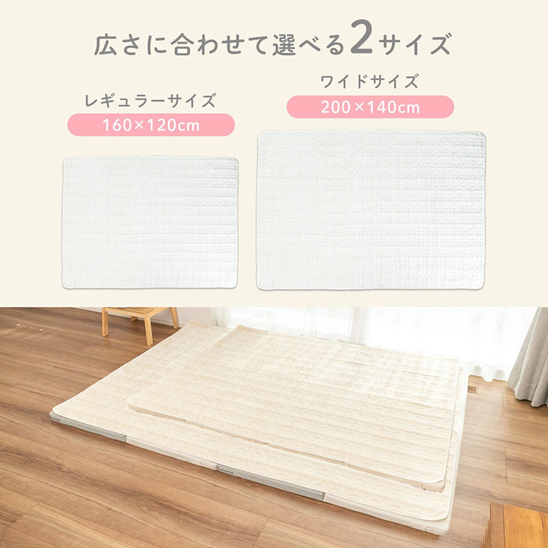 ●商品サイズ:[ワイドサイズ]200cm×140cm ●重量:1.62kg ●素材:ポリエステル100% ●パッケージサイズ:530×530×70mm ※圧縮梱包となっております。 ●洗濯方法:丸洗い&タンブル乾燥(上限60℃まで)OK(洗濯ネット使用) ●その他: ※閲覧時のモニター環境や光の当たり方などによって、 写真と実際の商品の色合いが異なって見える場合がございます。 予めご了承ください。 ※本製品を装着した上を走ったりしないでください。すべりやすく危険です。 ※すべりが気になる場合は、すべり止めシートをご使用ください。