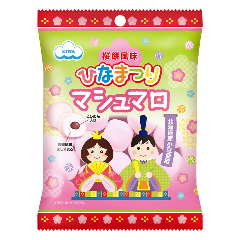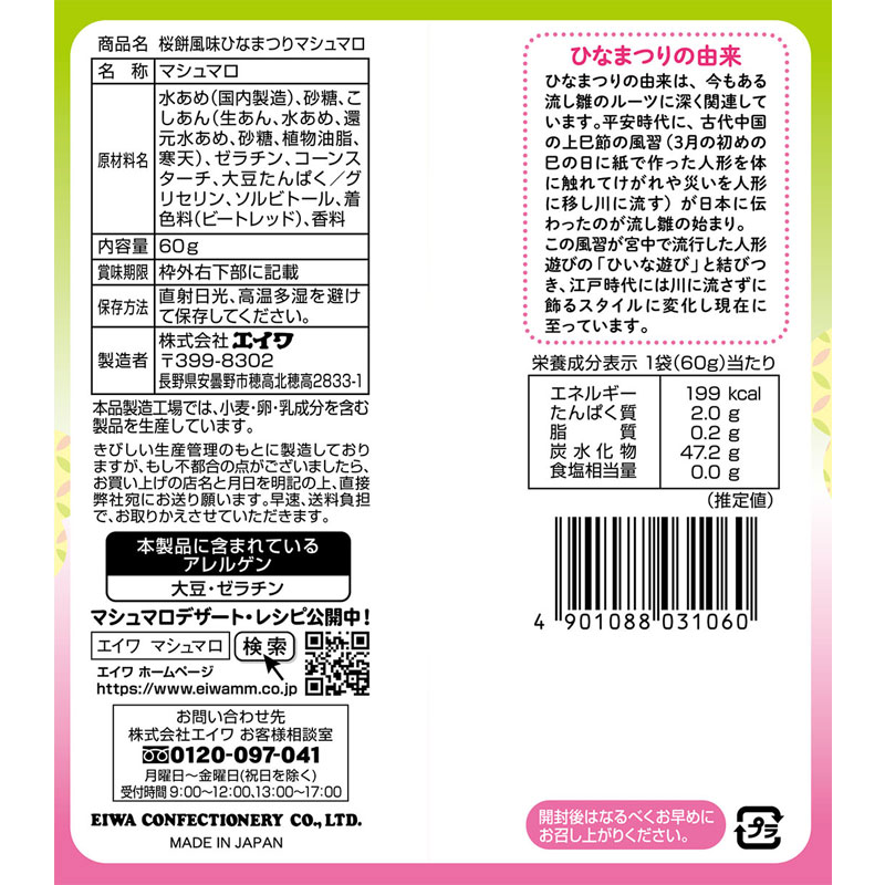 ●対象月齢:3歳頃~ ●マシュマロ ●原材料: 水あめ(国内製造)、砂糖、こしあん(生あん、水あめ、還元水あめ、砂糖、植物油脂、寒天)、 ゼラチン、コーンスターチ、大豆たんぱく/グリセリン、ソルビトール、着色料(ビートレッド)、香料 ●商品サイズ(約・mm):180×140×30 ●内容量:60g ●栄養成分:1袋(60g)当たり [熱量]199kcal [たんぱく質]2.0g [脂質]0.2g [炭水化物]47.2g [食塩相当量]0g [ナトリウム]-mg