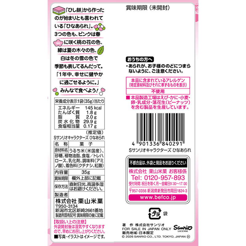 ●名称:菓子 ●原材料:うるち米(米国産)、砂糖、植物油脂、食塩/トレハロース、乳化剤、調味料(アミノ酸)、着色料(クチナシ、紅麹) ●内容量:35g ●栄養成分:1袋(35g)当たり 熱量 145kcal たんぱく質 1.8g 脂質 2.0g 炭水化物 29.9g 食塩相当量 0.17g (C) 2026 SANRIO CO., LTD. TOKYO, JAPAN