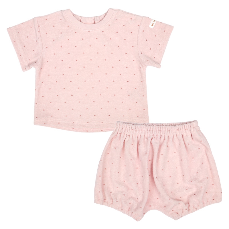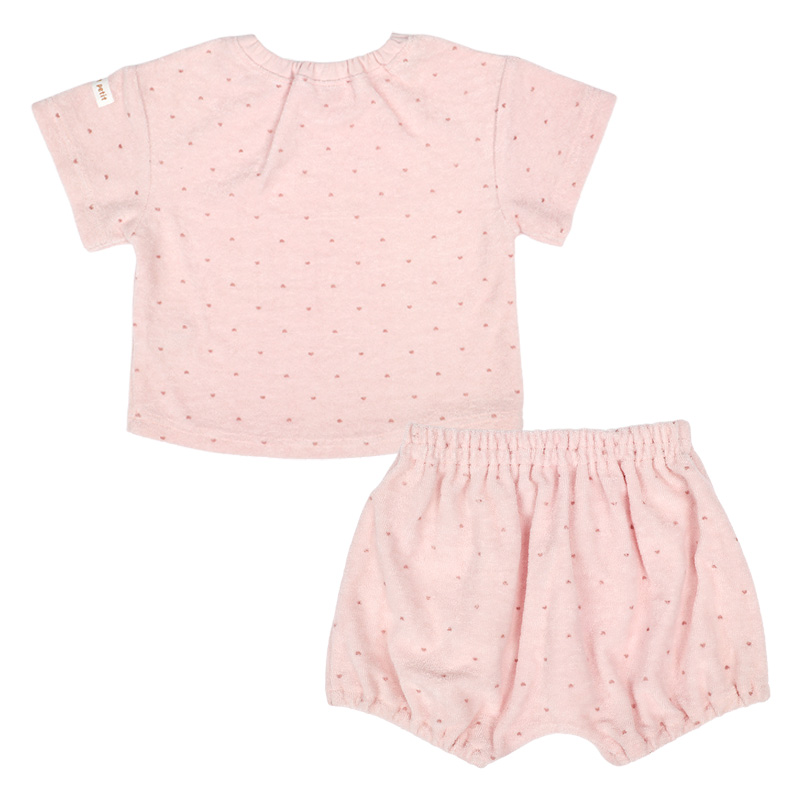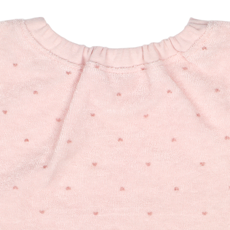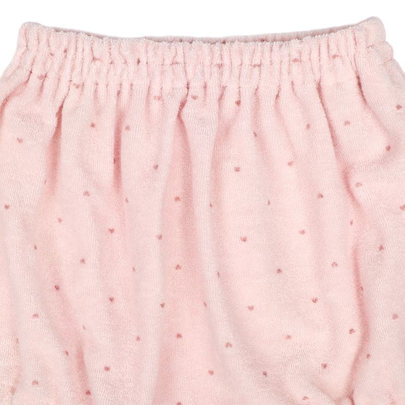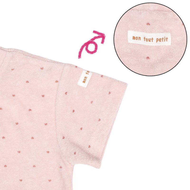●素材=トップス:本体 綿76%ポリエステル24% 縁取り 綿93%ポリウレタン7% パンツ:綿76%ポリエステル24% ●サイズ(約・cm)= トップス 70(着丈32・バスト30・袖丈8.5) 80(着丈34・バスト31・袖丈9) 90(着丈36・バスト32・袖丈9.5) パンツ 70(着丈20.5・ウエスト19・足口11.5) 80(着丈21.5・ウエスト20・足口12) 80(着丈22.5・ウエスト21・足口12.5)