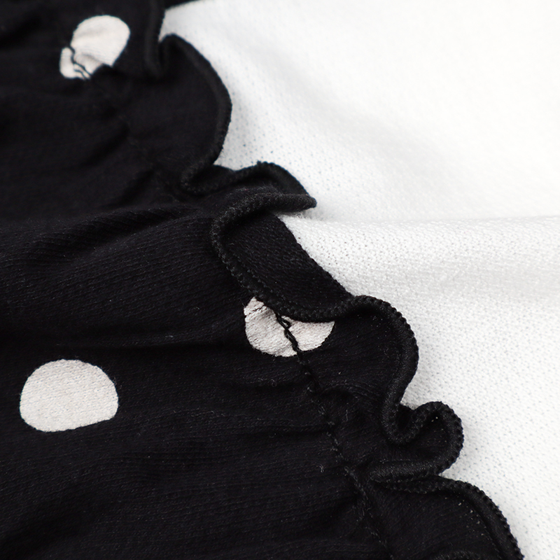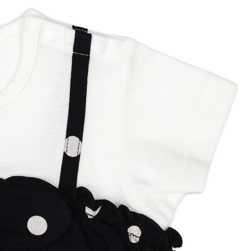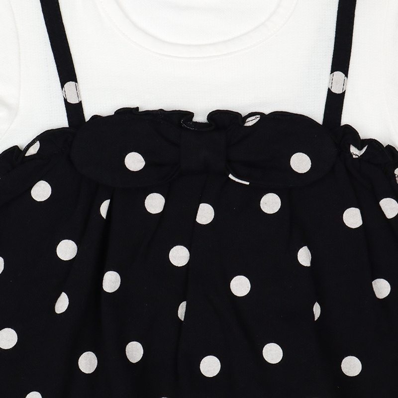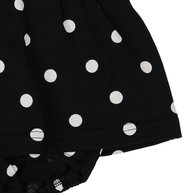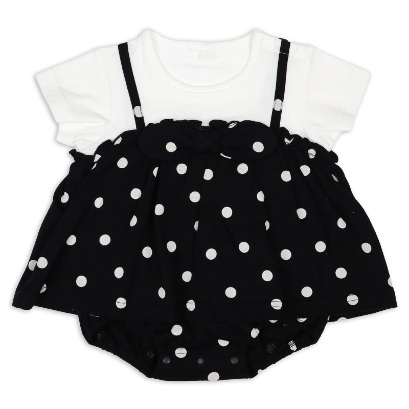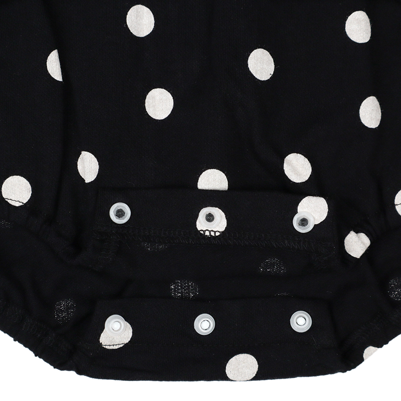 可愛らしいドット柄を落ち着いた黒字×白ドットで仕上げたロンパースです。モノトーンの配色が洗練された印象を与え、ベビーの愛らしさを一層引き立てます。