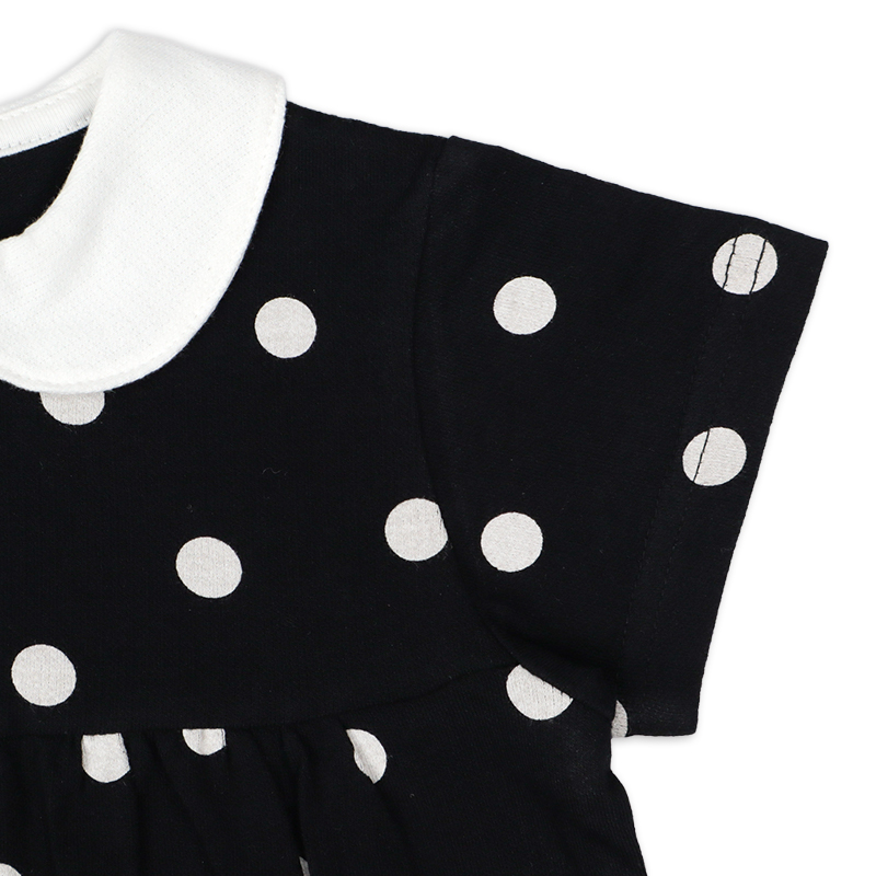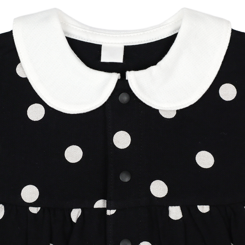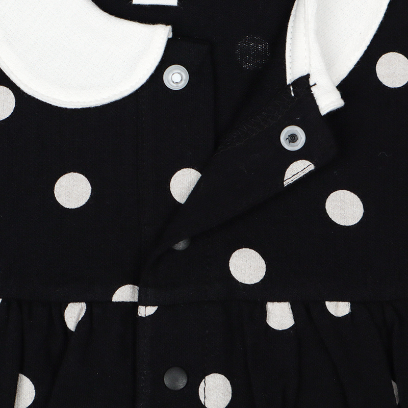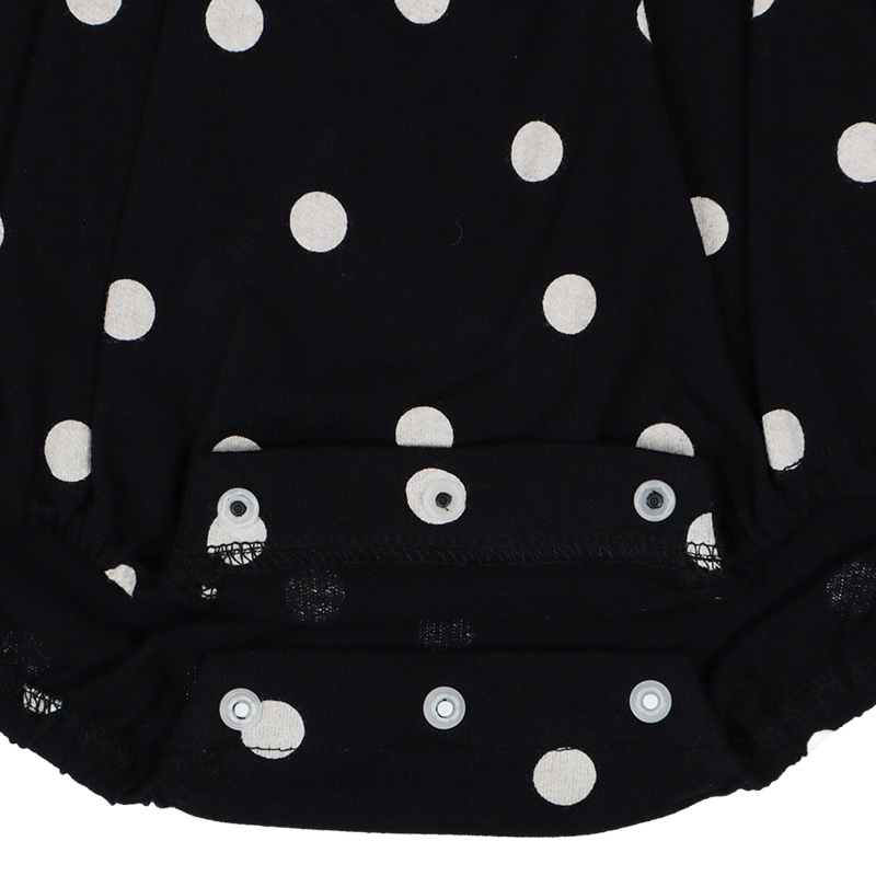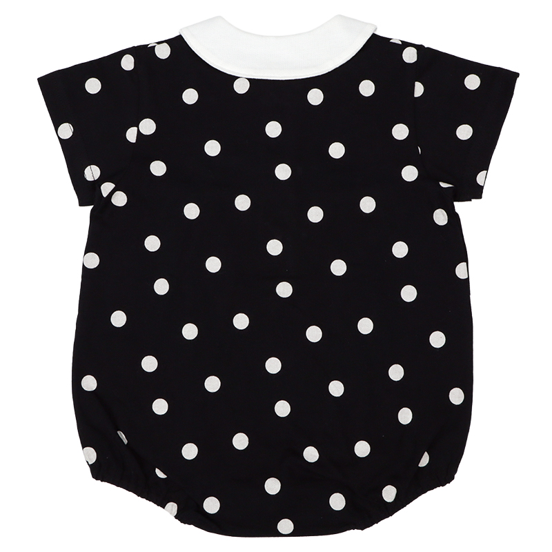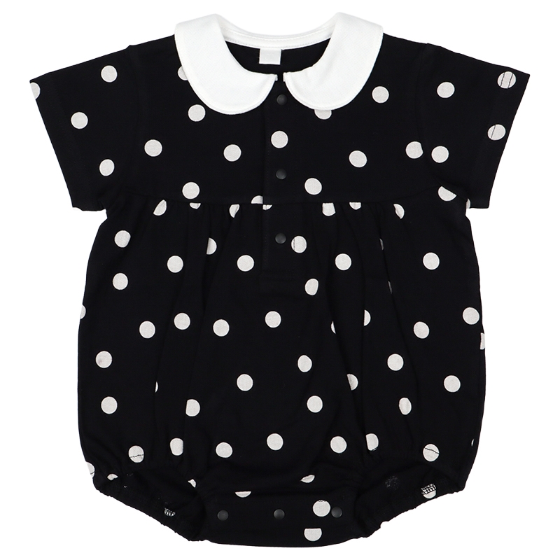 吸汗吸湿に優れている為、夏場でもサラリとした肌触りを楽しむ事が出来ます。 綿100%なので肌に優しいです。 前立、股下が着脱しやすいスナップボタンになってるので股下からかぶればお着替えもオムツ替えも楽々です。 また、ゆとりのあるシルエットになってます。 可愛らしいドット柄を落ち着いた黒字×白ドットで仕上げたロンパースです。モノトーンの配色が洗練された印象を与え、ベビーの愛らしさを一層引き立てます。