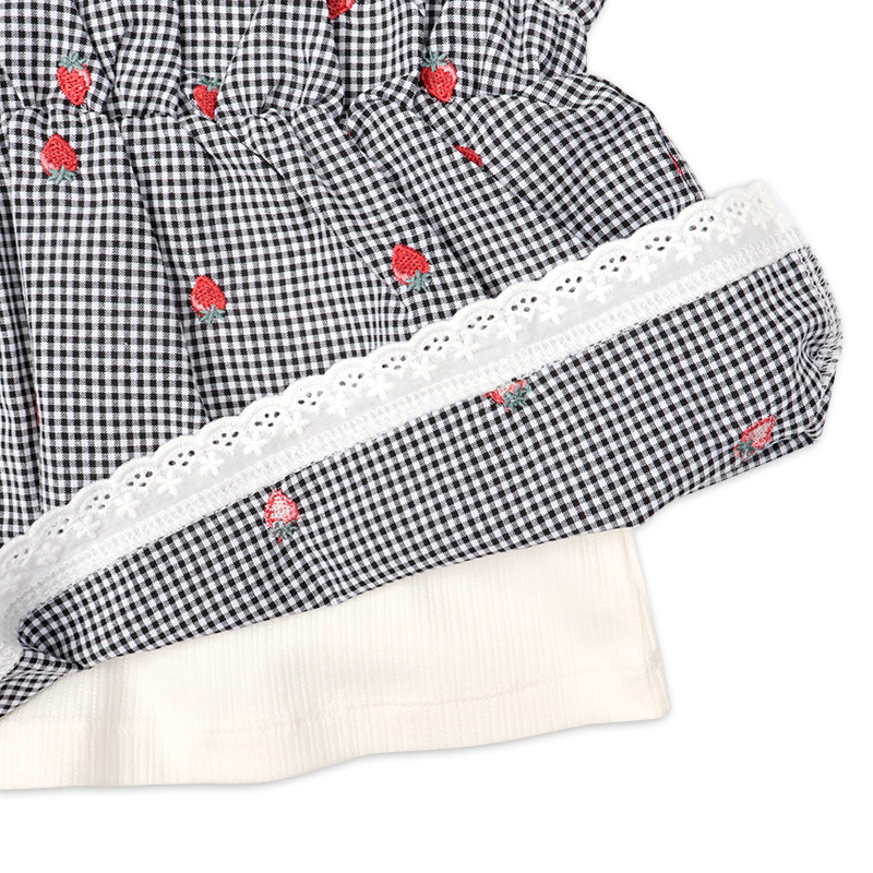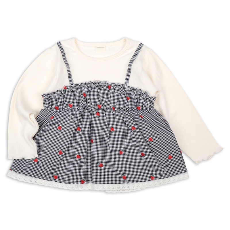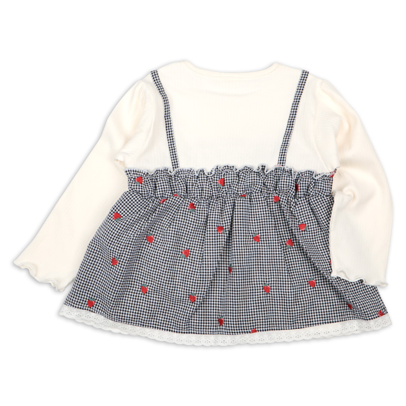 本体:綿56%ポリエステル37%ポリウレタン7% リブ部分:綿57%ポリエステル40%ポリウレタン3% 布帛部分:綿51%ポリエステル49% レース部分:綿100% 【100cm】着丈40胸囲62肩幅25袖丈32 【110cm】着丈43胸囲66肩幅27袖丈36.5 【120cm】着丈46胸囲70肩幅29袖丈41
