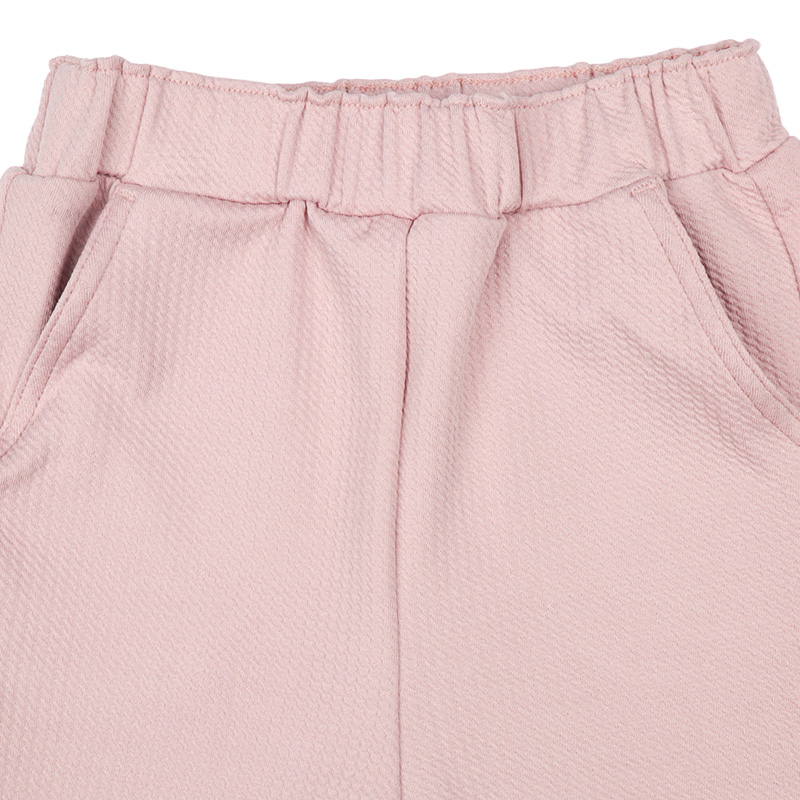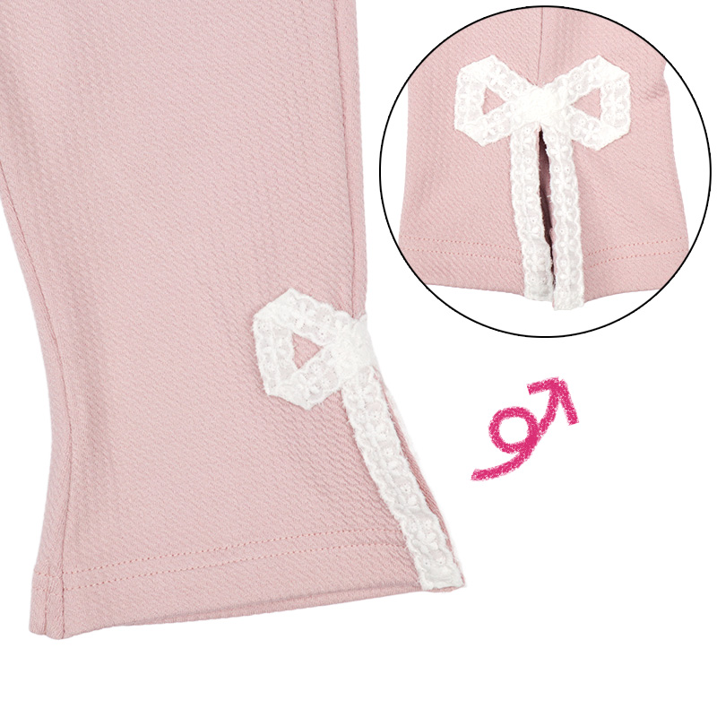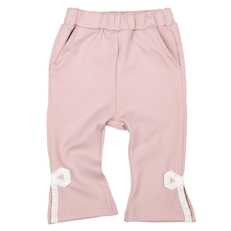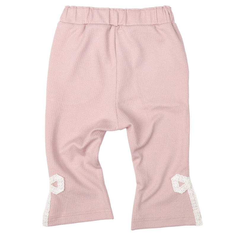 すっきりとしたシルエットと裾の脇に付けたレースリボンがおしゃれなパンツです。 10分丈のロングパンツより、少し短めの8分丈なので、裾のもたつきなく着用できます。 表面がデコボコとした、はきやすい、伸縮性のある生地を使用しています。 名前が書けるお名前タグ付きです。