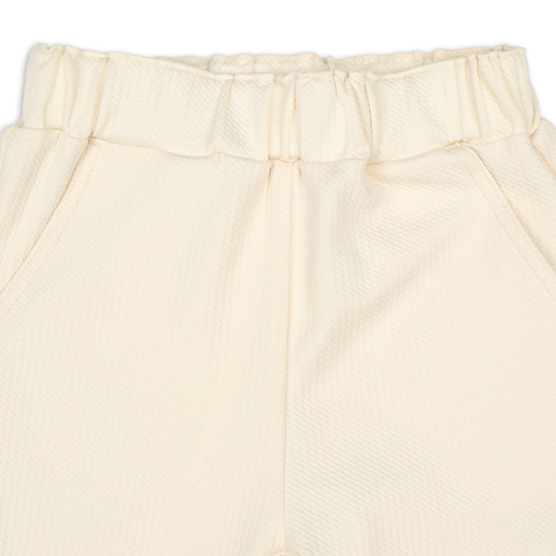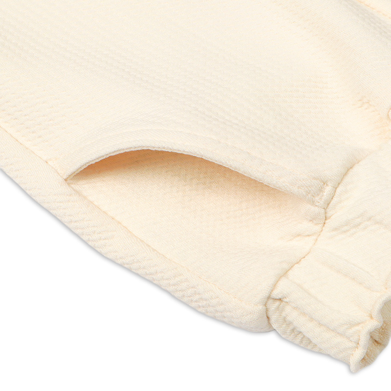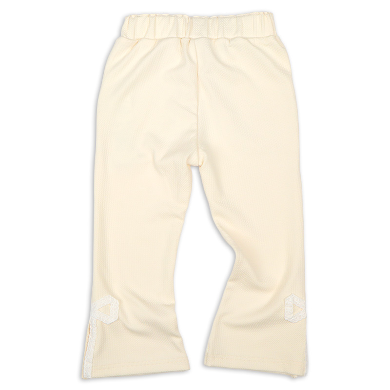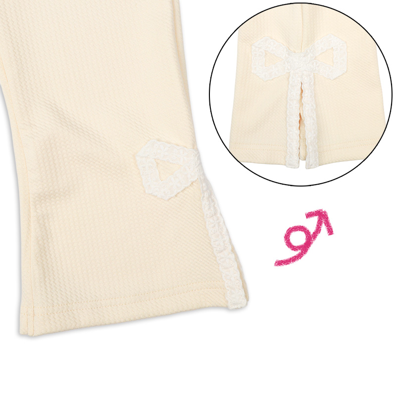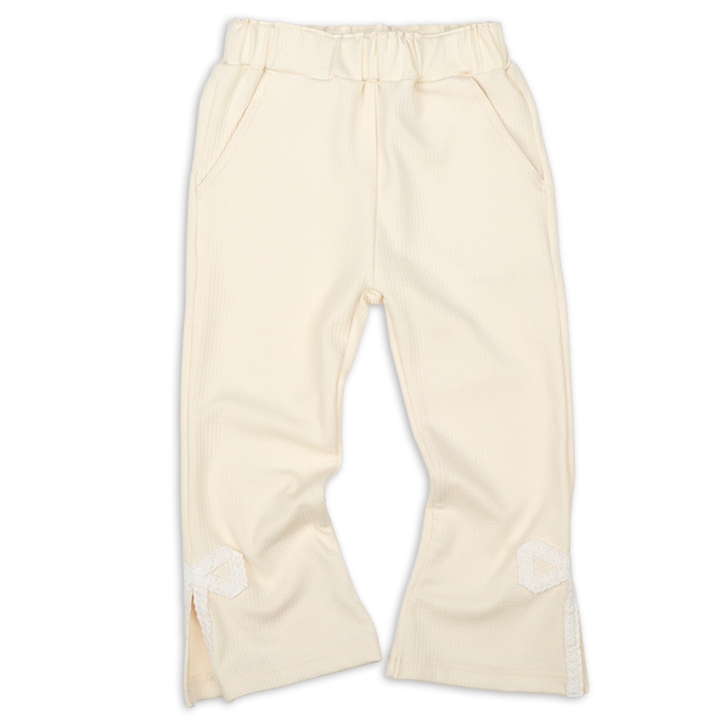 すっきりとしたシルエットと裾の脇に付けたレースリボンがおしゃれなパンツです。10分丈のロングパンツより、少し短めの8分丈なので、裾のもたつきなく着用できます。表面がデコボコとした、はきやすい、伸縮性のある生地を使用しています。名前が書けるお名前タグ付きです。