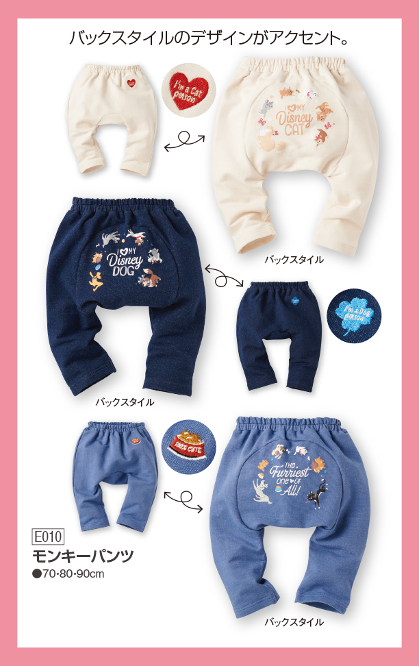 赤ちゃん本舗オリジナルデザインのモンキーパンツです。 ストレッチミニ裏毛素材を使用しています。ゆったりとしたモンキーシルエットでお子様のはじめてのセパレートアイテムにぴったりな1枚です。前身の刺しゅう使いとおしりの集合デザインがかわいいアイテムです。普段着にもお出かけにも使えます。