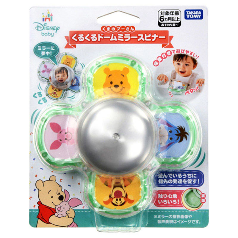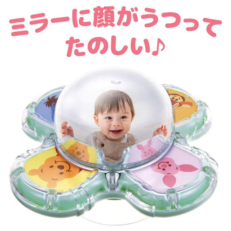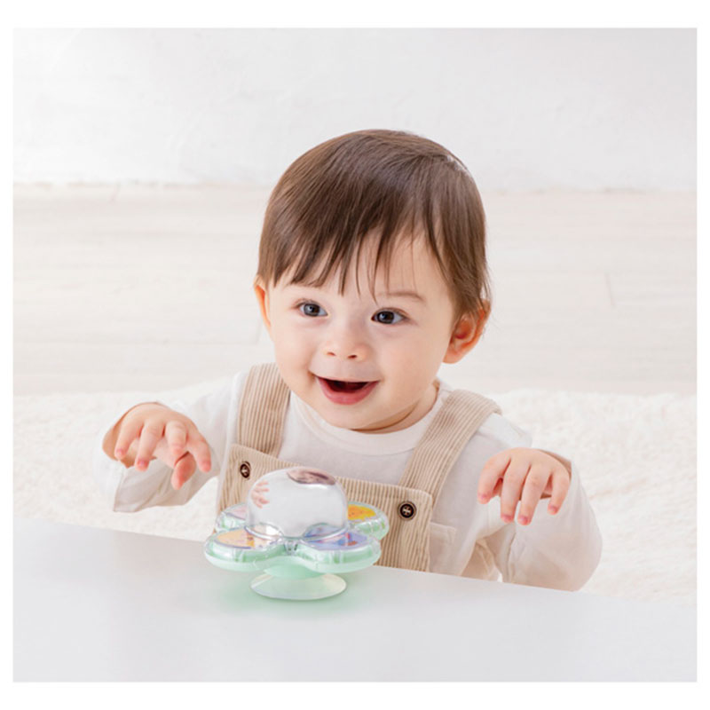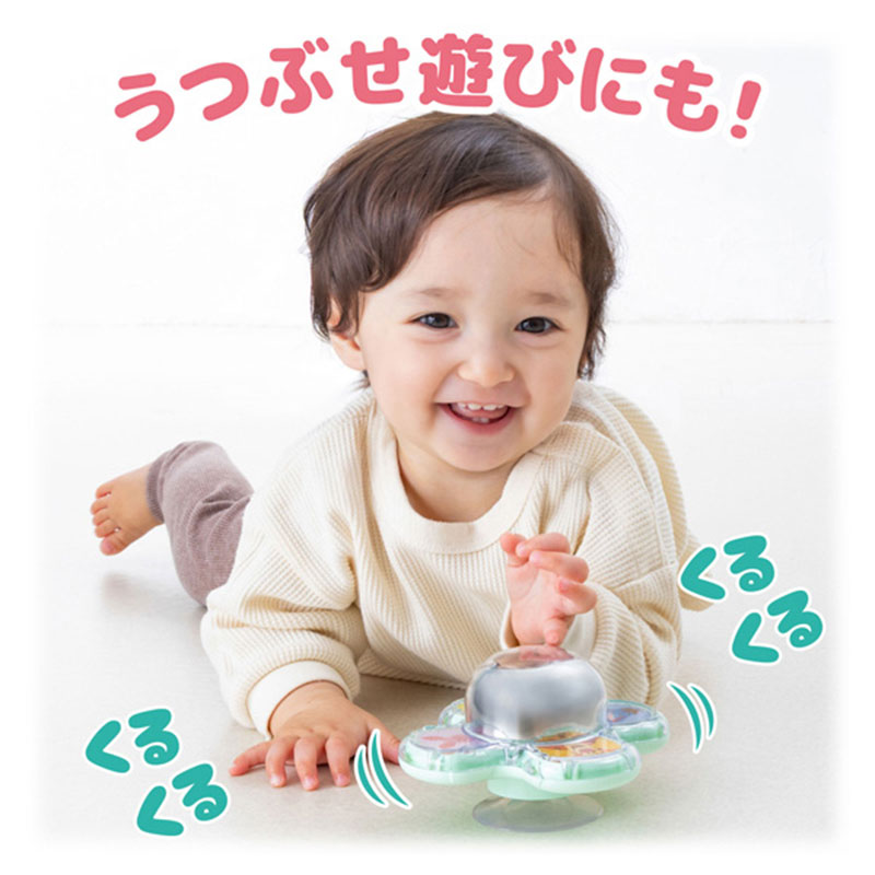 赤ちゃんの力でも回しやすいハンドスピナーとミラーが合体! 遊びながら指先の発達を促します。 吸盤つきでペタッとくっつくので遊びやすく、 ドーム型ミラーは、上から見るのと横から見るので異なる映りで回転すると キャラクターが次々変わって楽しめます。 透明カバー付きで舐めても安心安全。 スピナーの裏面は凹凸柄になっていていろいろな触り心地が楽しめます。 ※吸盤は光沢のある平らな面のみにくっつきます。