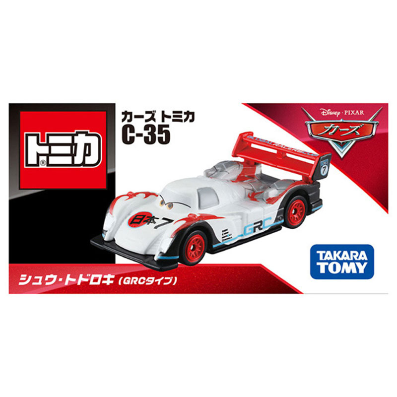 カーズの新テーマ「GRC(グローバル・レーサーズ・カップ)」がカーズトミカに登場! 流線型のボディとリアウィング、、GRCロゴがスピード感と迫力を演出。 ホワイトボディに赤のホイールとアクセントカラーの水色が映える、目を引くデザインです。