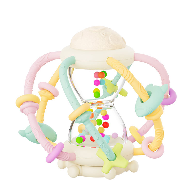 振って楽しいシリコンのボールおもちゃ♪ 見た目も可愛いシリコン製のラトルボール。 振ると「ガラガラ」と音が鳴ります。 また、下部のパーツはクルクルとまわるので、 まわすと「カチカチ」と音が鳴ります。