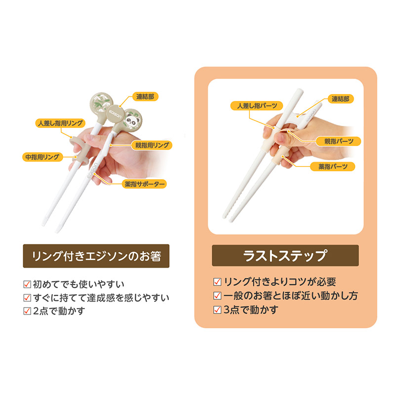 人間工学に基づいたお箸の完成形。 自分の力でつかむ、正しい持ち方 お箸のマナーや手指の器用さを育む、作業療法士と共同開発した 正しく・美しく持てるお箸です。 一般のお箸へのラストステップ。これで持てたらもう完璧。 指先から手の動かし方まで考え抜かれた構造だから、美しい所作で食べられます。 入学準備やお箸のマナー練習におすすめです。