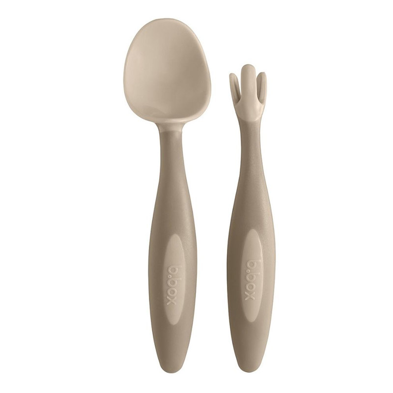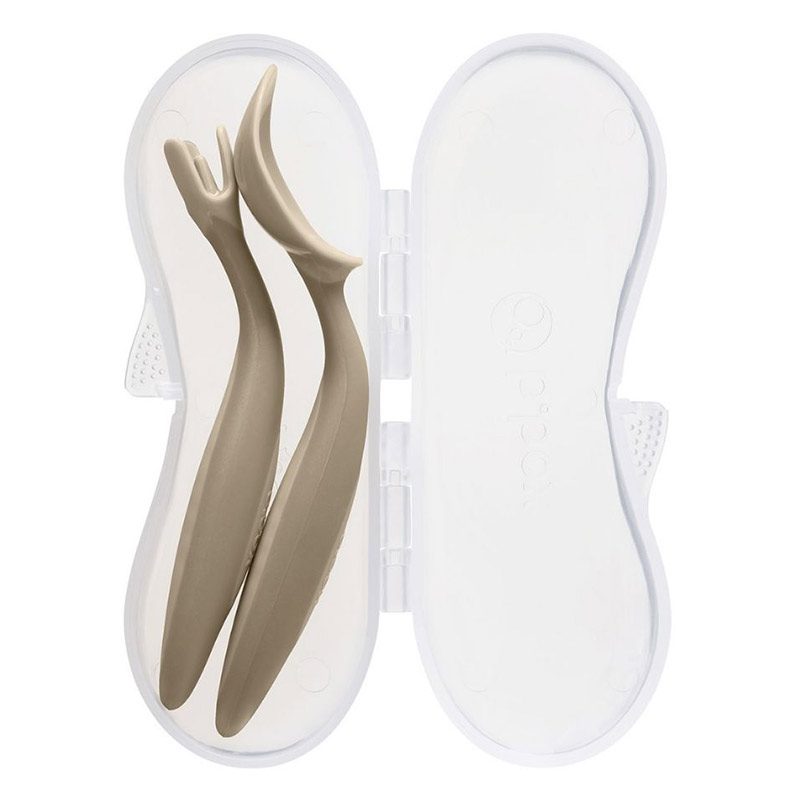 左右対称でユニークな形のスプーンとフォークのカトラリーセットです。