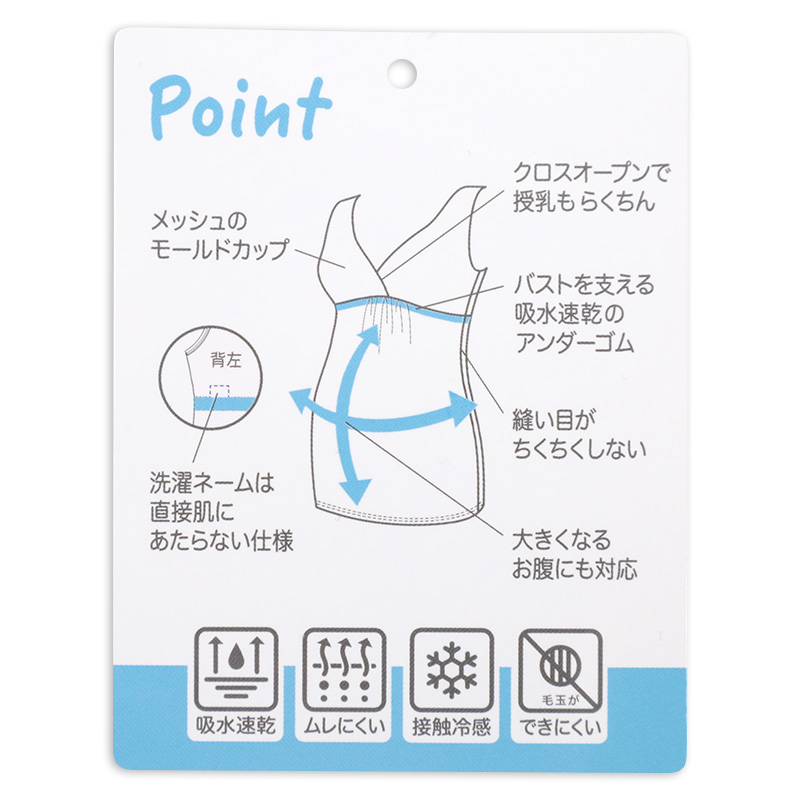 吸水速乾性、吸放湿性、接触冷感性・抗ピリング性のある、ひんやりムレにくい機能性マタニティインナーです。クロスオープン仕様の授乳機能があり、肌面メッシュのやわらかモールドカップ使用・アンダーゴムでバストをサポートする仕様のため、産前から産後まで長くご着用いただけます。アンダーゴムは吸水速乾タイプを採用しました。