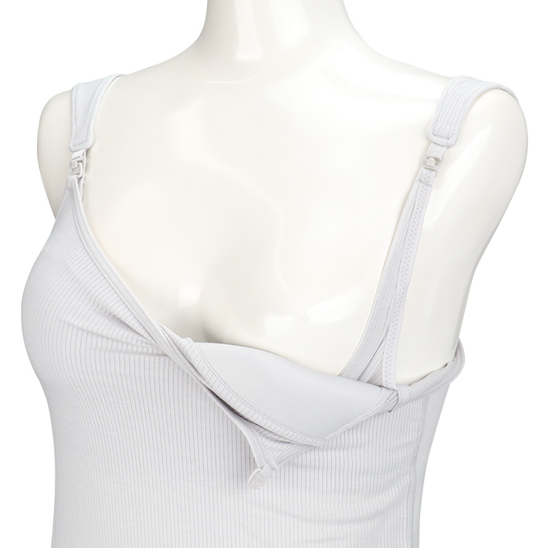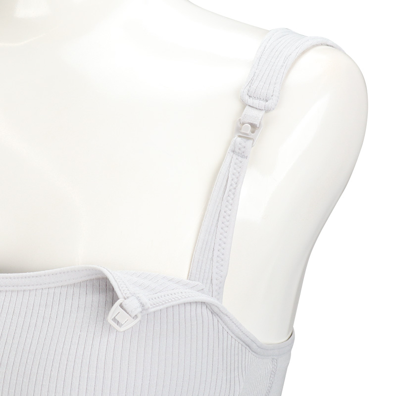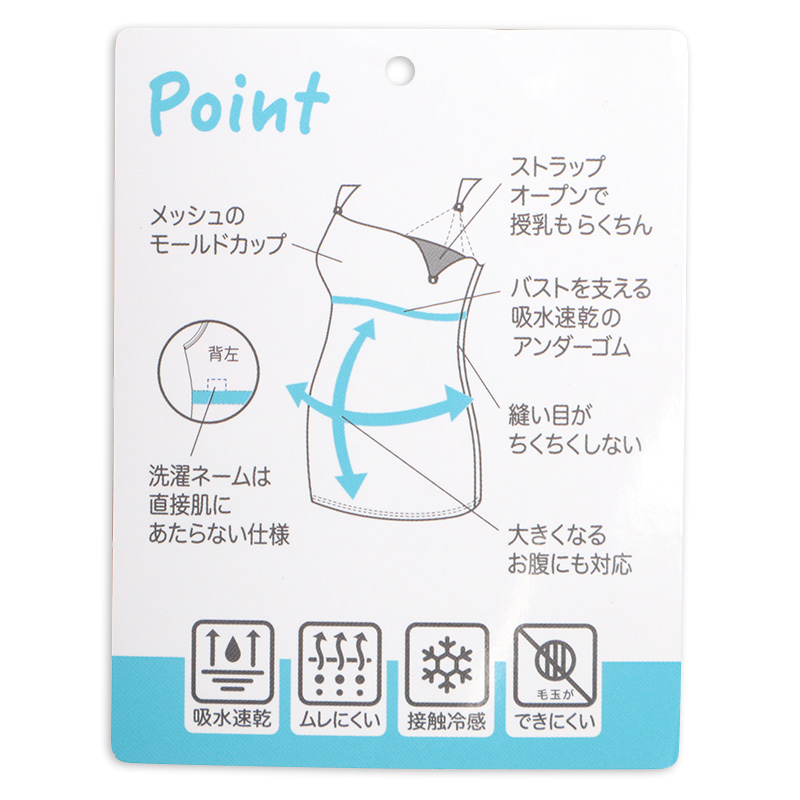 吸水速乾性、吸放湿性、接触冷感性・抗ピリング性のある、ひんやりムレにくい機能性マタニティインナーです。 ストラップオープン仕様の授乳機能があり、肌面メッシュのやわらかモールドカップ使用・アンダーゴムでバストをサポートする仕様のため、産前から産後まで長くご着用いただけます。 アンダーゴムは吸水速乾タイプを採用しました。