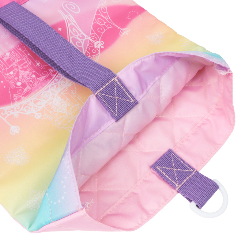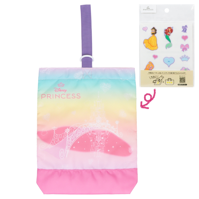 プリンセスのシューズケース。中綿入りで布に貼れるシールが付いているので好きな所に貼って自分だけのオリジナルのシューズケースが制作可能です。