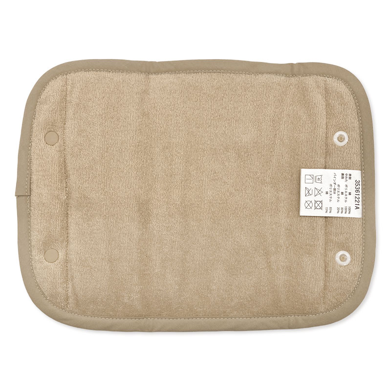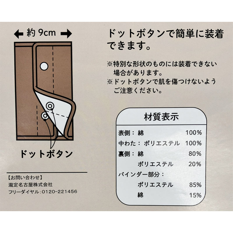 ●サイズ:[着用時]高さ約17cm×巾約9cm ●素材: [表側・ガーゼ]綿100% [中わた・ポリエステルわた]ポリエステル100% [裏側・パイル]綿80%・ポリエステル20% [バインダー部分・ブロード]ポリエステル85%・綿15% ●取り扱い注意: ・濡れたまま長時間放置してないでください。 ・洗濯ネットを使用してください。 ・濃色品は濡れた状態の摩擦により色移りする事があります。 ・洗濯は他の物と分けて取り扱ってください。 ・蛍光増白剤入り洗剤の使用はお避け下さい。 ・釦は閉じて洗濯してください。