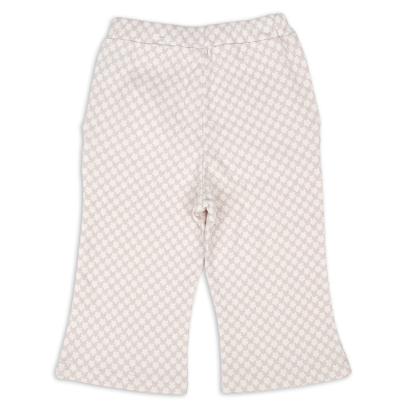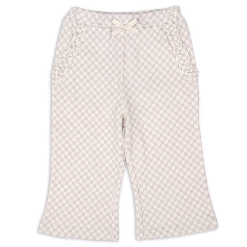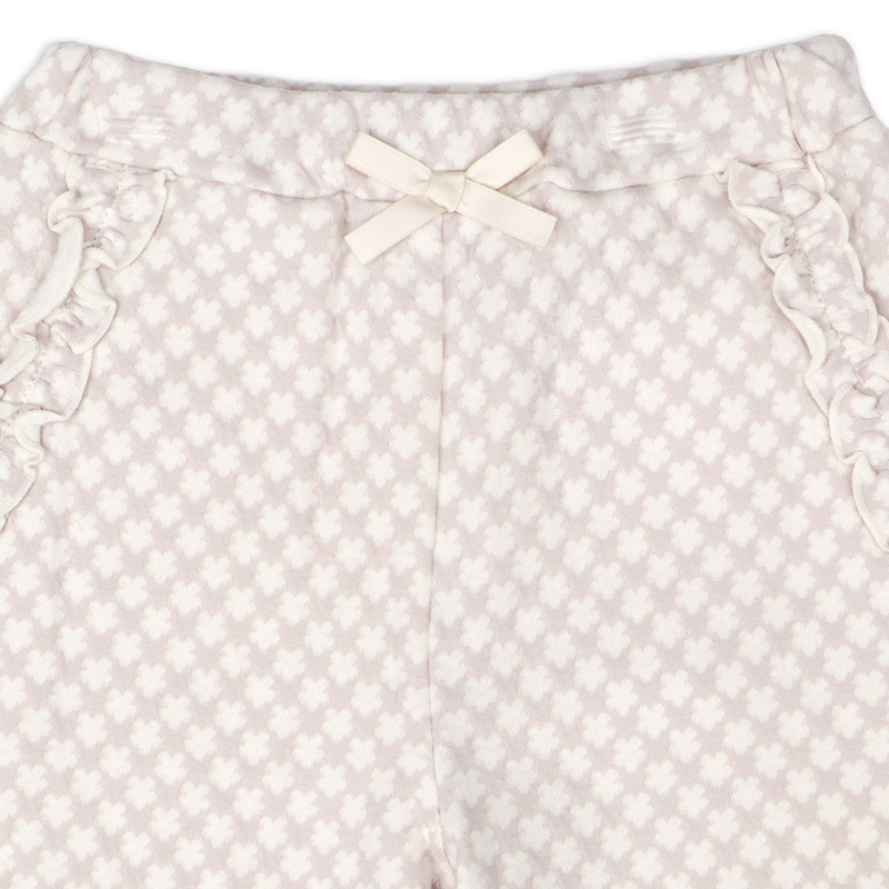 花柄の7分丈のジャガードパンツです。 ウエスト部分のリボンとポケットのフリルがポイントです。 サイズは70~120と幅広くご用意をしているので、お子様の成長にあわせてぴったりのサイズをお選びいただけます。 お揃いコーデも楽しめます。 お名前ネームが付いています。