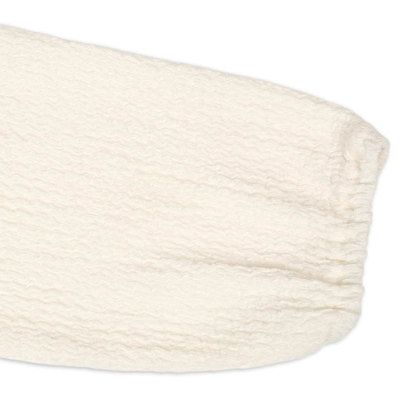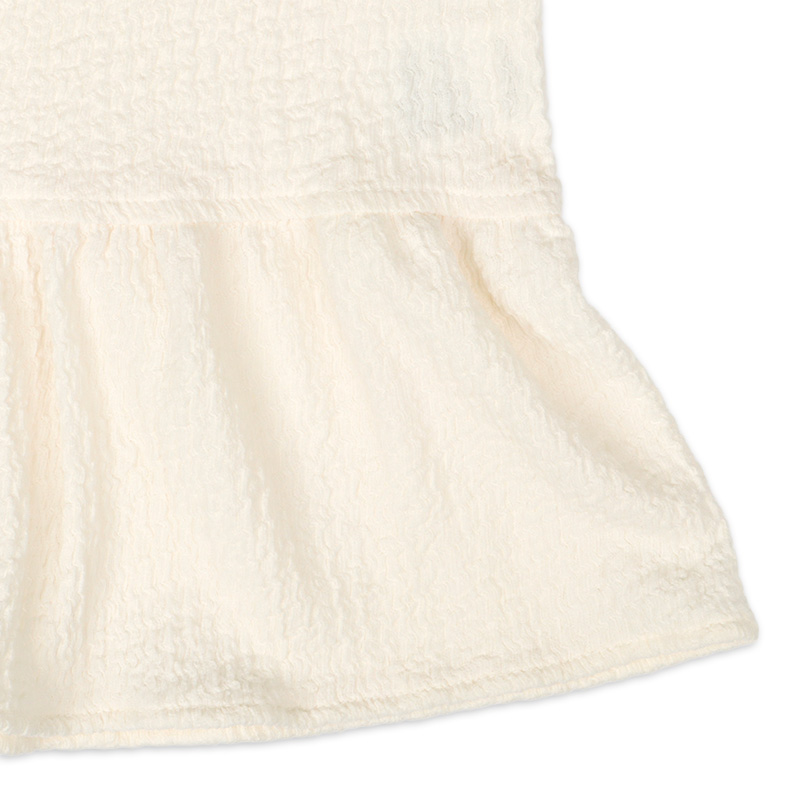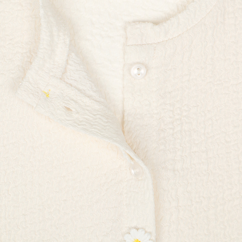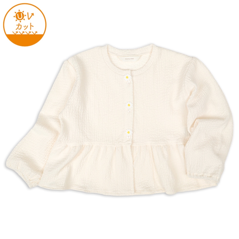 透け感のあるふっくらとしたジャガード生地のUVカーディガンです。 釦明きには、お花のモチーフと裾のフリルがポイントです。 シンプルなデザインなので、コーディネイトもしやすいアイテムです。 お名前が書けるネーム付きです。 冷房対策としてもおすすめです。