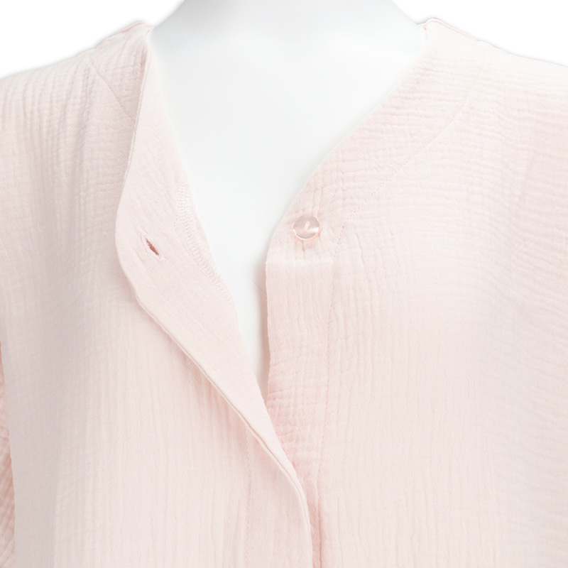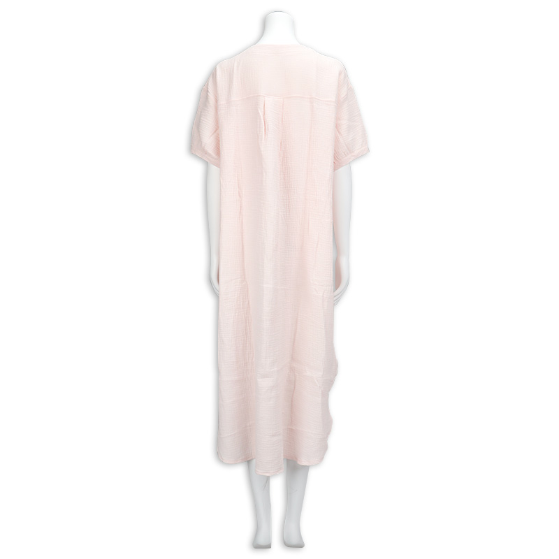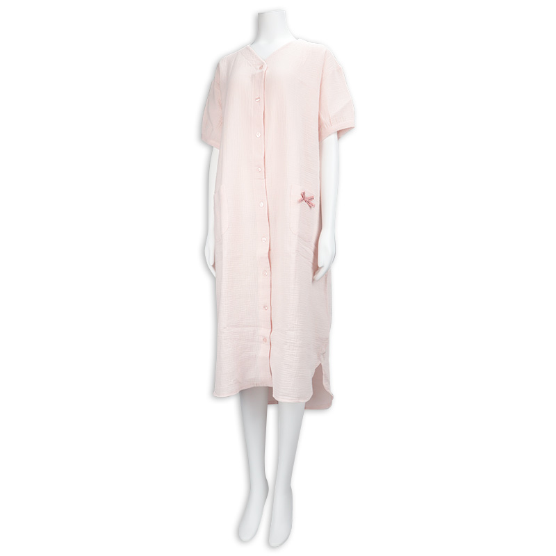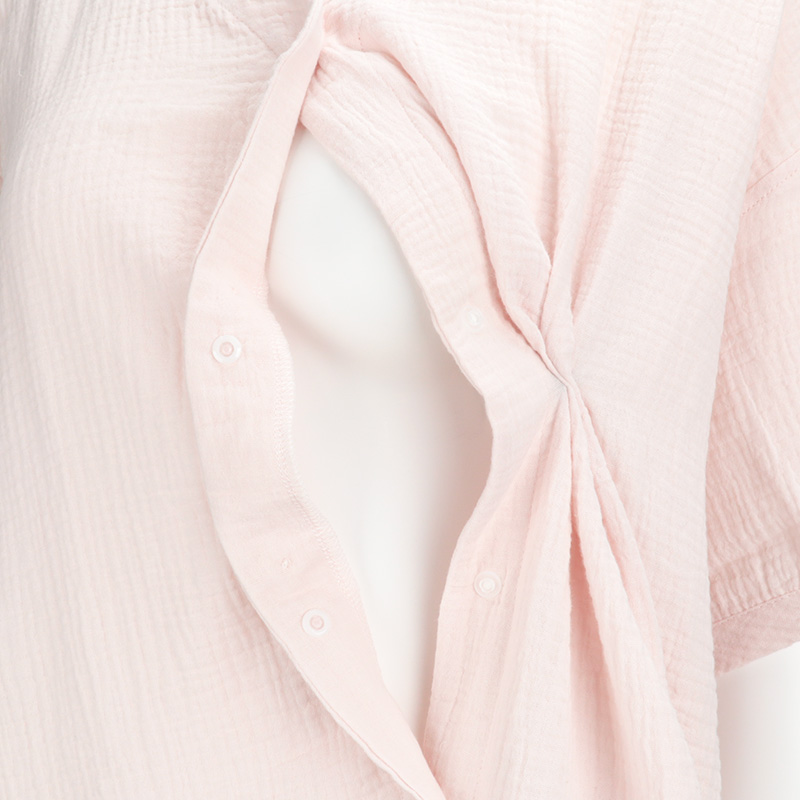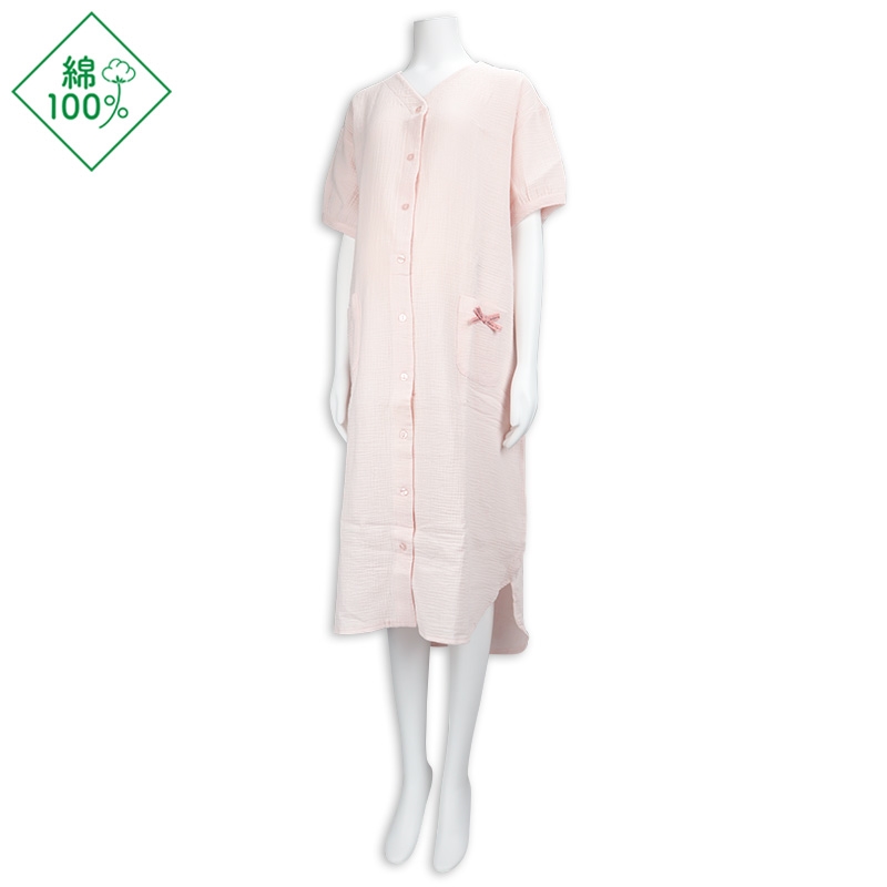 マタニティ夏向け、半袖ワンピースパジャマです。 素材は綿100%のWガーゼを使用。 通気性に優れておりとても快適な上に、包み込むような風合いで優しい温かみもある商品です。 第二・第三ボタンはプラスチックボタン開閉にしており、授乳する際は着脱簡単。 サイズはM~Lの1サイズ、ピンク無地のシンプルな商品で、新生児ガーゼドレスオールのピンク色と同じ色になります。