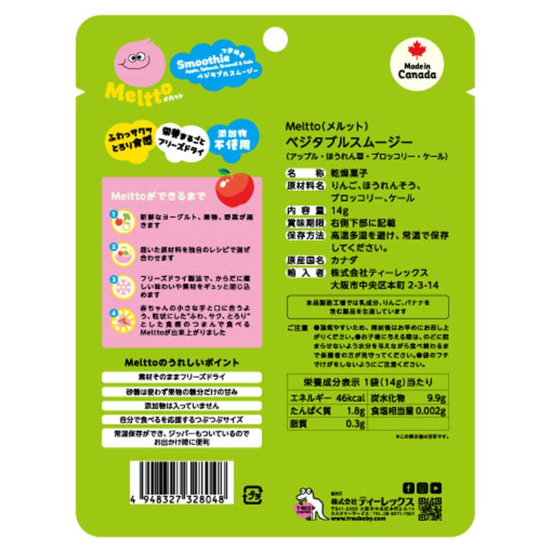 ●名称:乾燥菓子 ●原材料名:りんご、ほうれんそう、ブロッコリー、ケール ●内容量:14g ●保存方法:高温多湿を避け、常温で保存 ●栄養成分表示1袋(14g)当たり:エネルギー46kcal、たんぱく質1.8g、脂質0.3g、炭水化物9.9g、食塩相当量0.002g