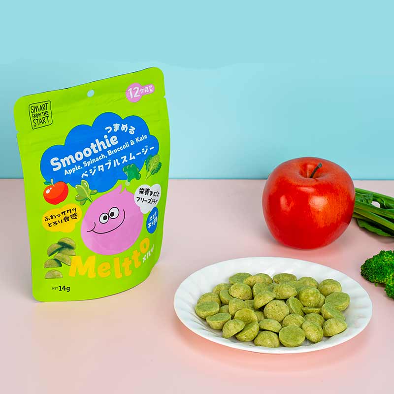 ふわっ サクッ とろり食感 栄養まるごとフリーズドライ ヨーグルトや果物、野菜を独自のレシピで組み合わせ、フリーズドライ製法でドロップ状にした口の中でとろけるつまめるドロップシリーズ。 砂糖や香料、甘味料は一切使用せず、果物の糖分だけで甘みを付けているので、安心してお子様に与えることが出来ます。 粒の大きさは小さいお子様がつまんで食べるを練習するちょうどいいサイズ。 自分でつまんで自分で食べるを応援するおやつです。 常温保存が出来き、袋にジップが付いているので、お出かけのお供に便利なおやつです。