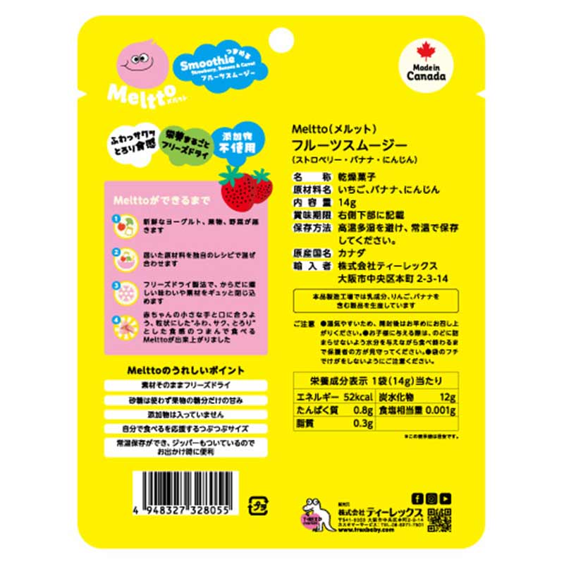 ●名称:乾燥菓子 ●原材料名:いちご、バナナ、にんじん ●内容量:14g ●保存方法:高温多湿を避け、常温で保存 ●栄養成分表示1袋(14g)当たり:エネルギー52kcal、たんぱく質0.8g、脂質0.3g、炭水化物12g、食塩相当量0.001g