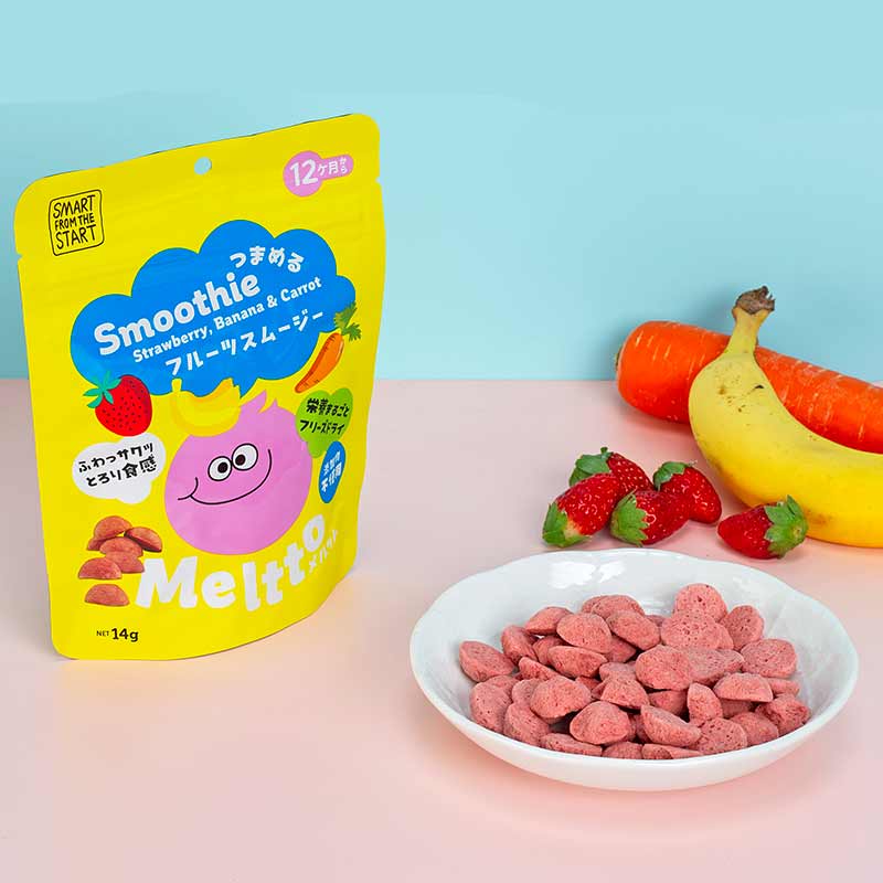ふわっ サクッ とろり食感 栄養まるごとフリーズドライ ヨーグルトや果物、野菜を独自のレシピで組み合わせ、フリーズドライ製法でドロップ状にした口の中でとろけるつまめるドロップシリーズ。 砂糖や香料、甘味料は一切使用せず、果物の糖分だけで甘みを付けているので、安心してお子様に与えることが出来ます。 粒の大きさは小さいお子様がつまんで食べるを練習するちょうどいいサイズ。 自分でつまんで自分で食べるを応援するおやつです。 常温保存が出来き、袋にジップが付いているので、お出かけのお供に便利なおやつです。